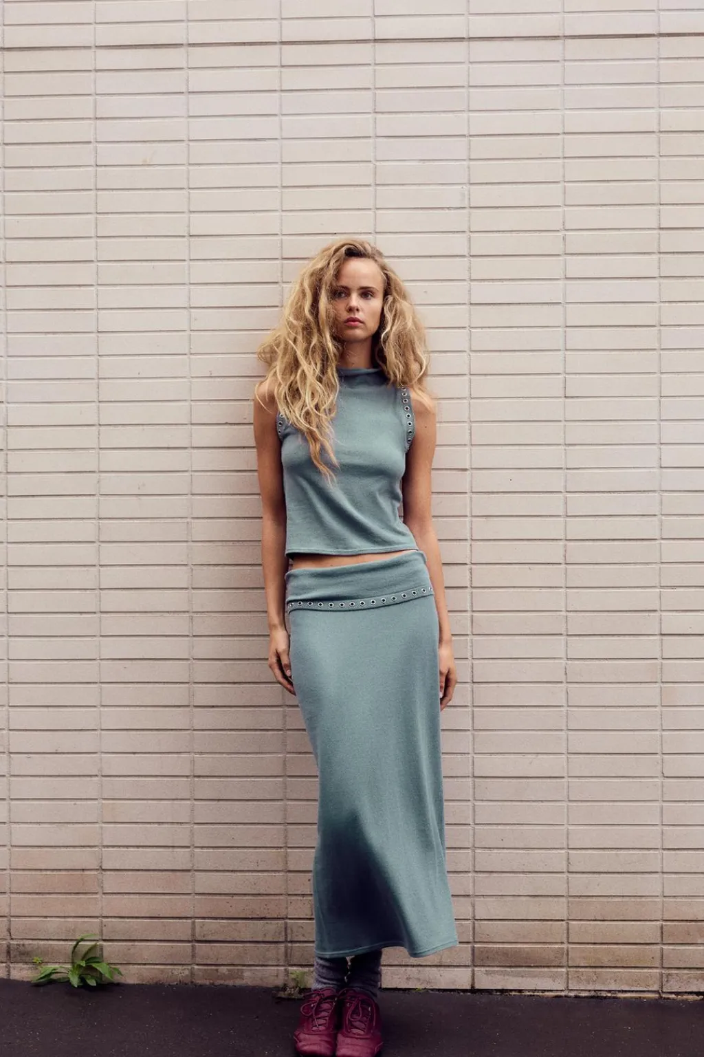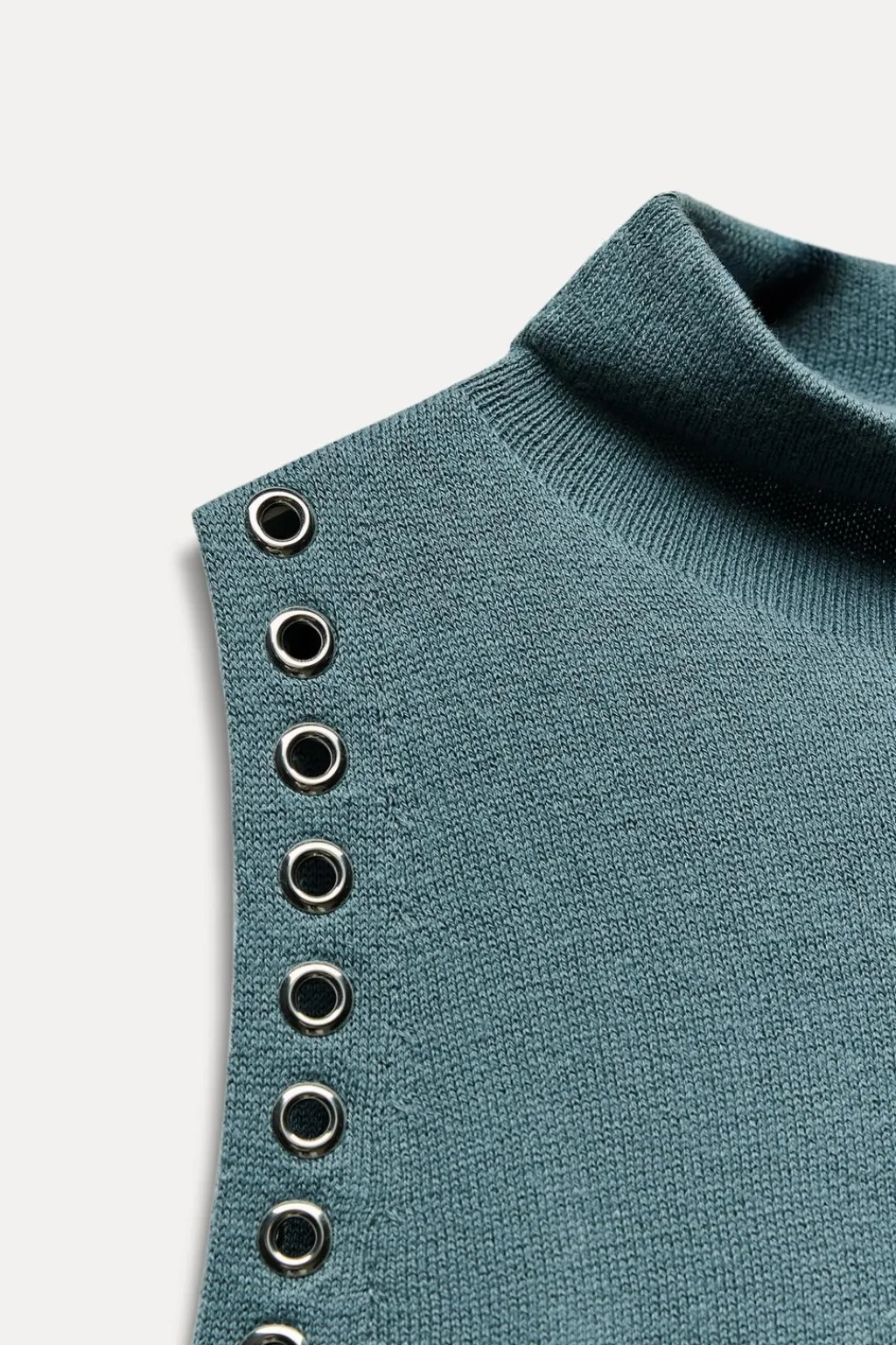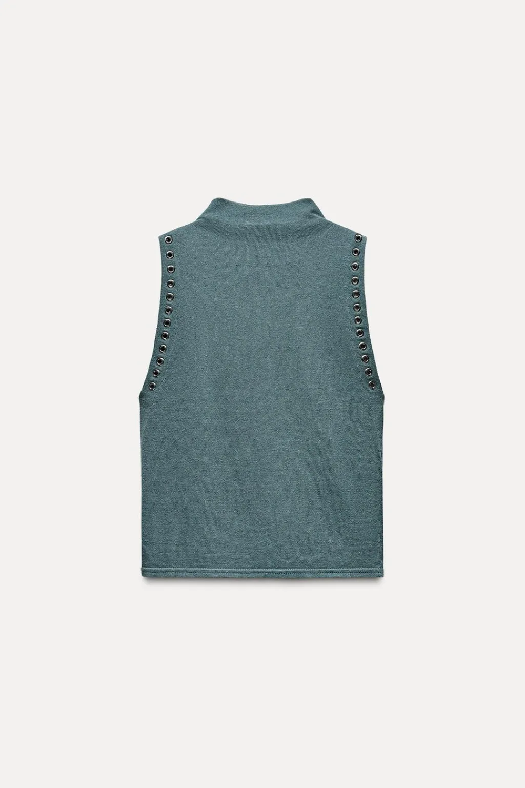 Top de cuello subido y manga sisa. Detalle de arandelas metálicas.