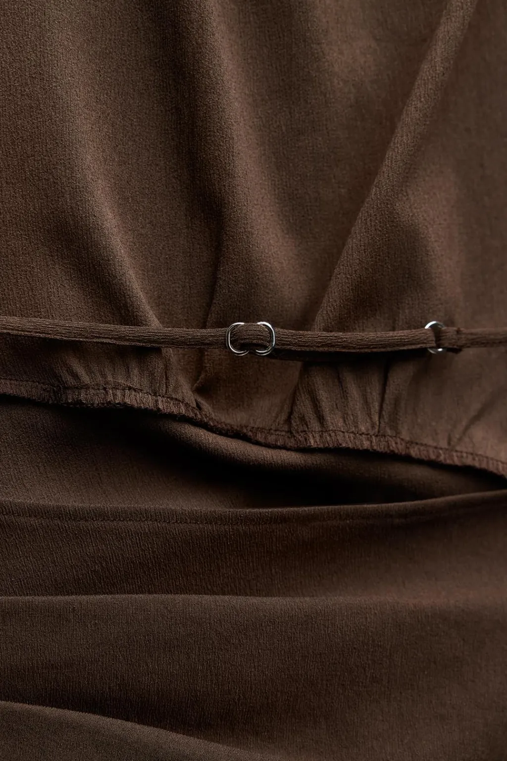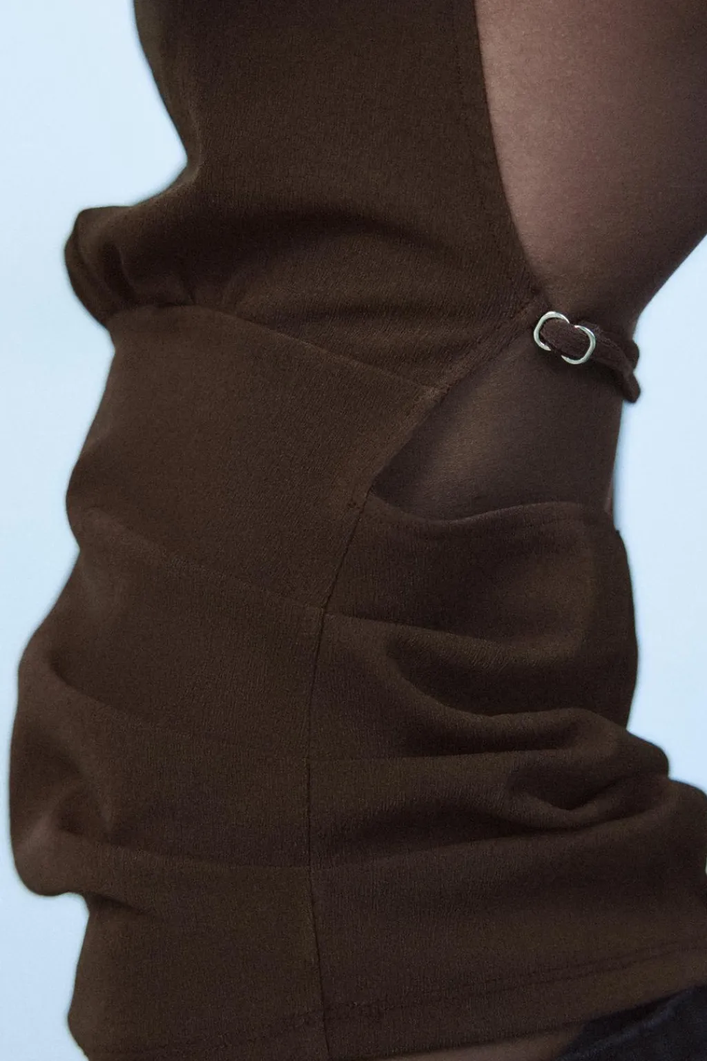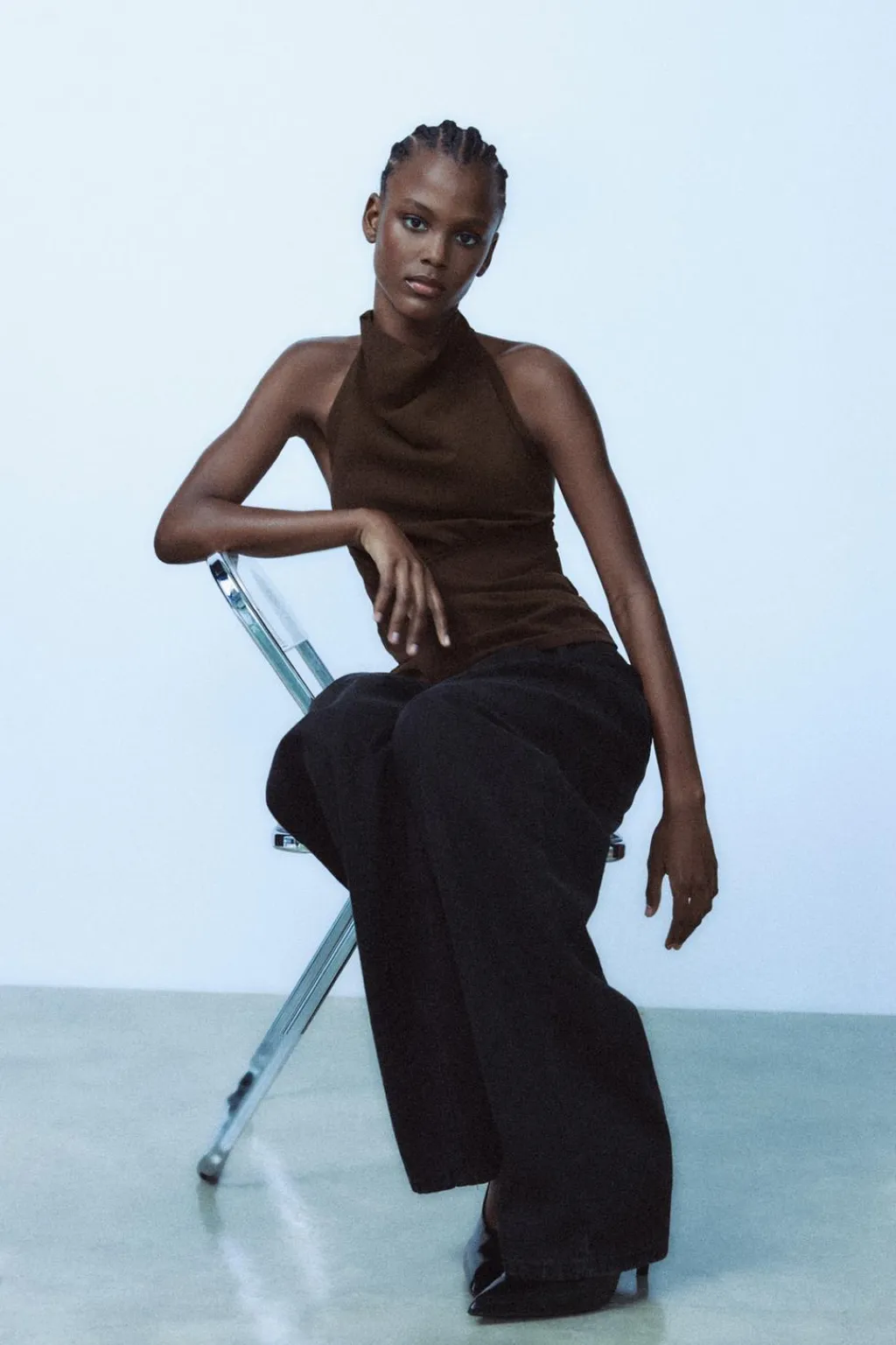 Top de cuello halter con botones. Espalda descubierta con tira ajustable. Detalle de pliegues en delantero.