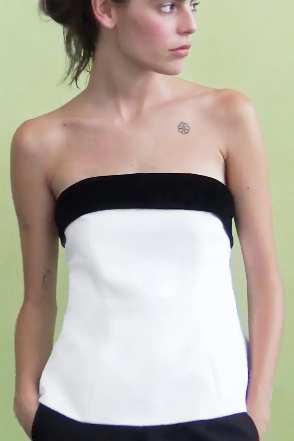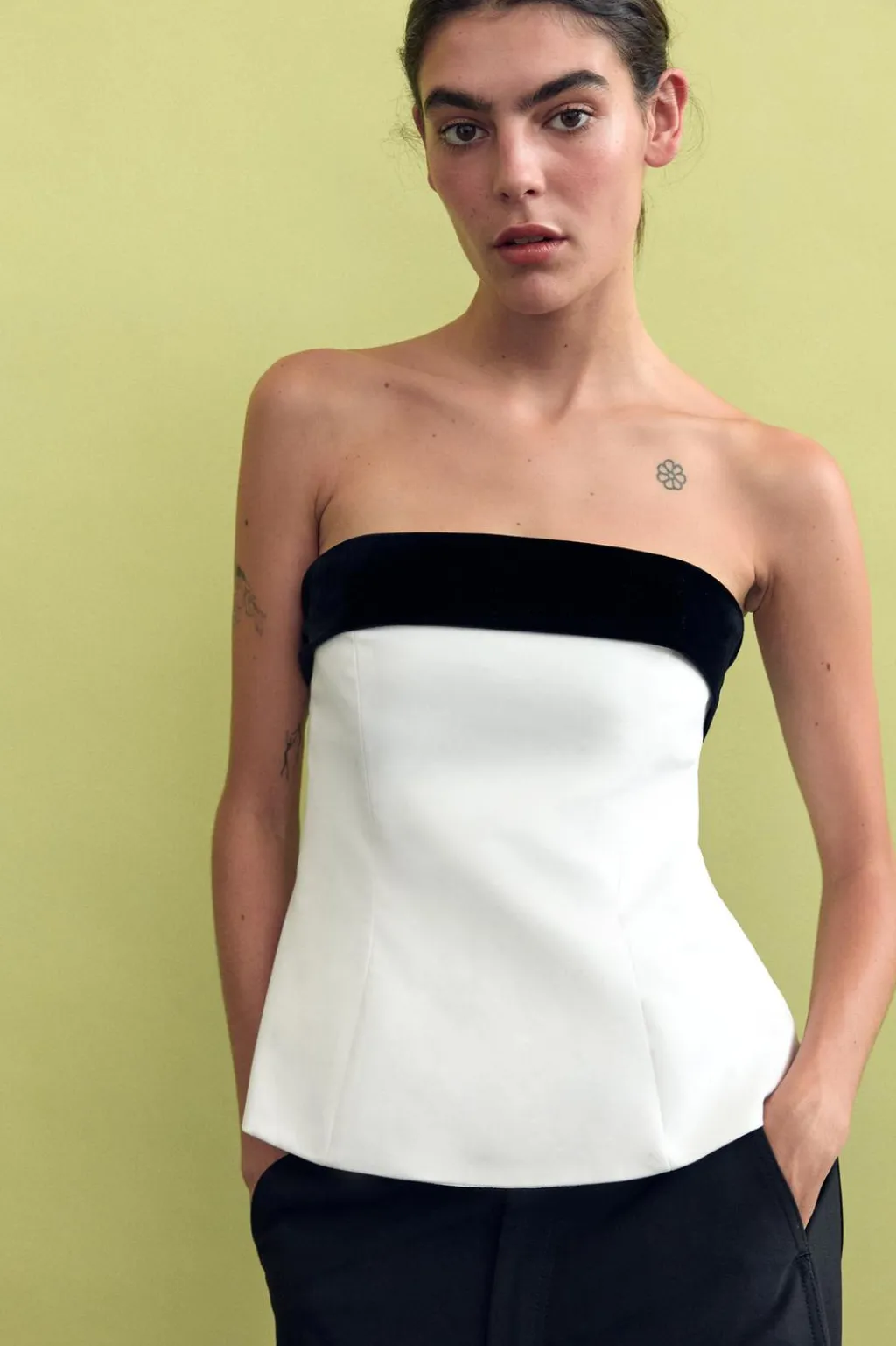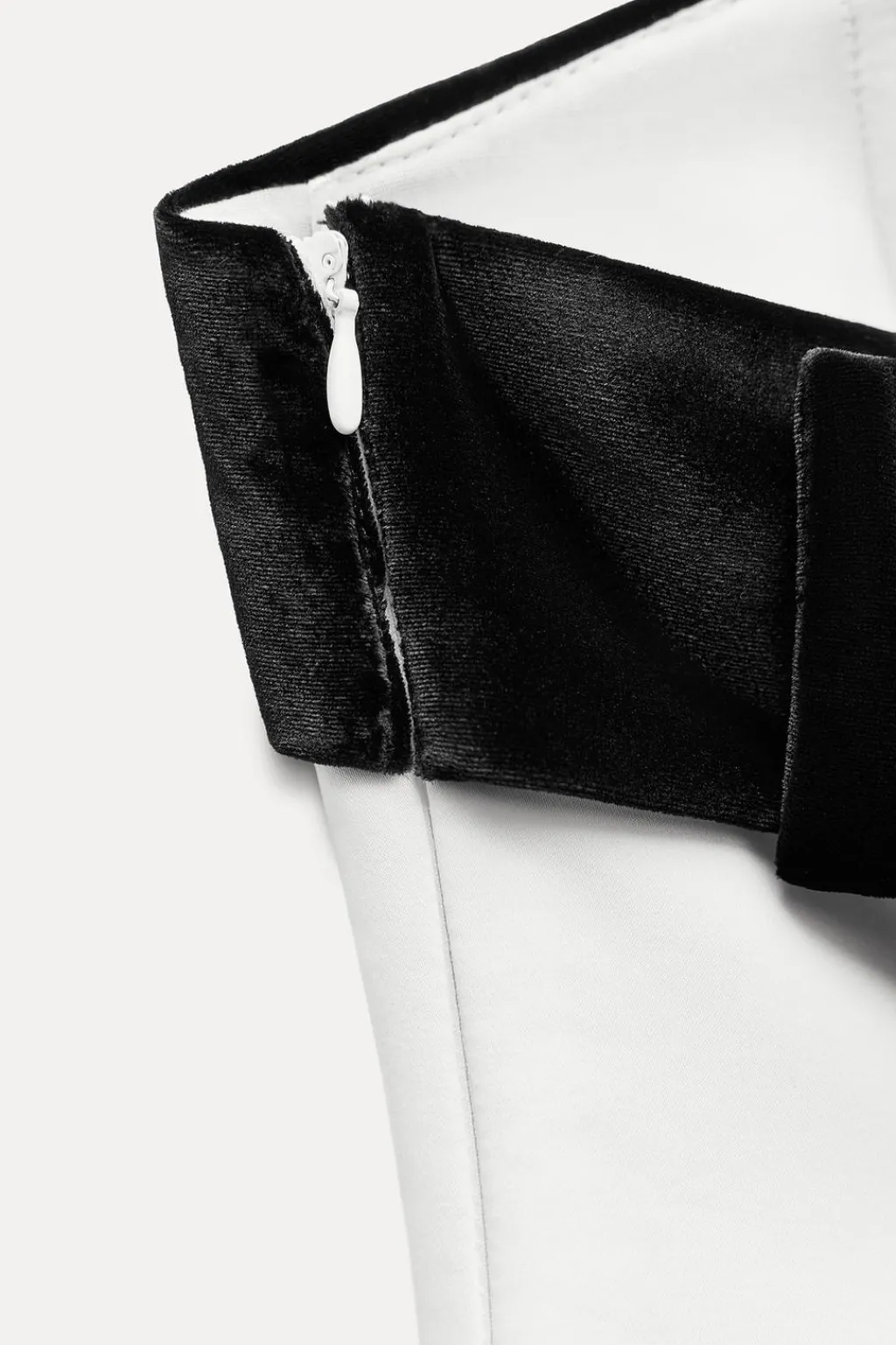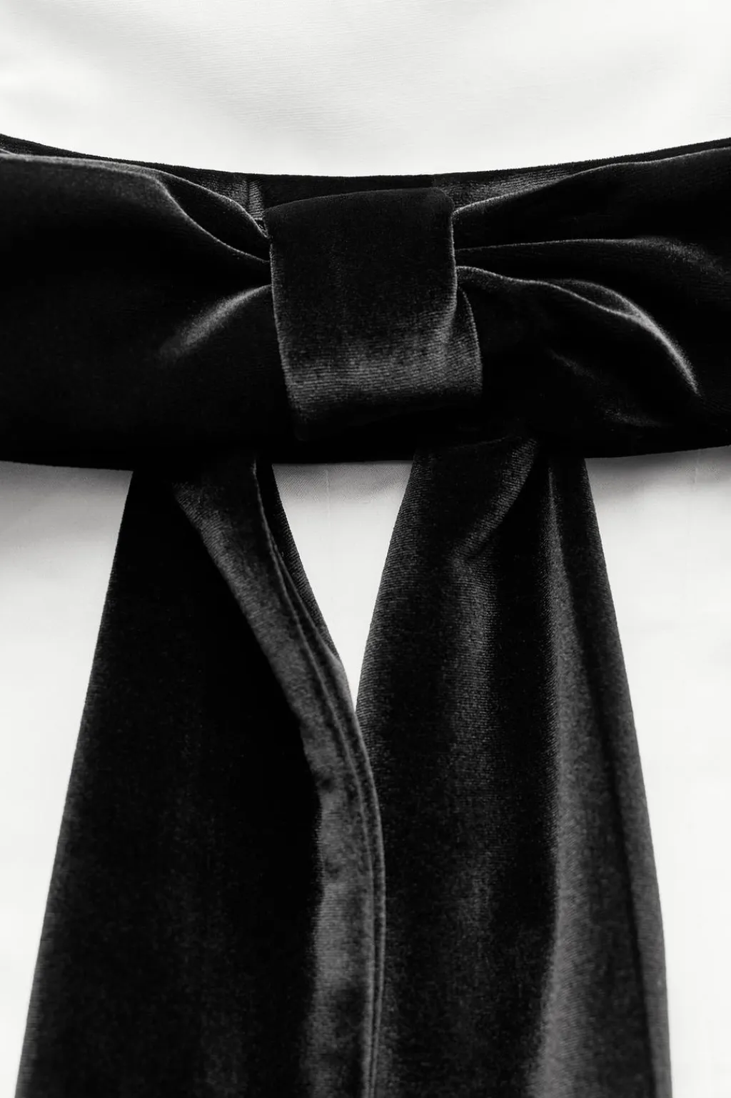 Top de escote recto y hombros descubiertos. Detalle de lazo combinado en terciopelo en espalda. Forro interior. Cierre lateral con cremallera oculta en costura.