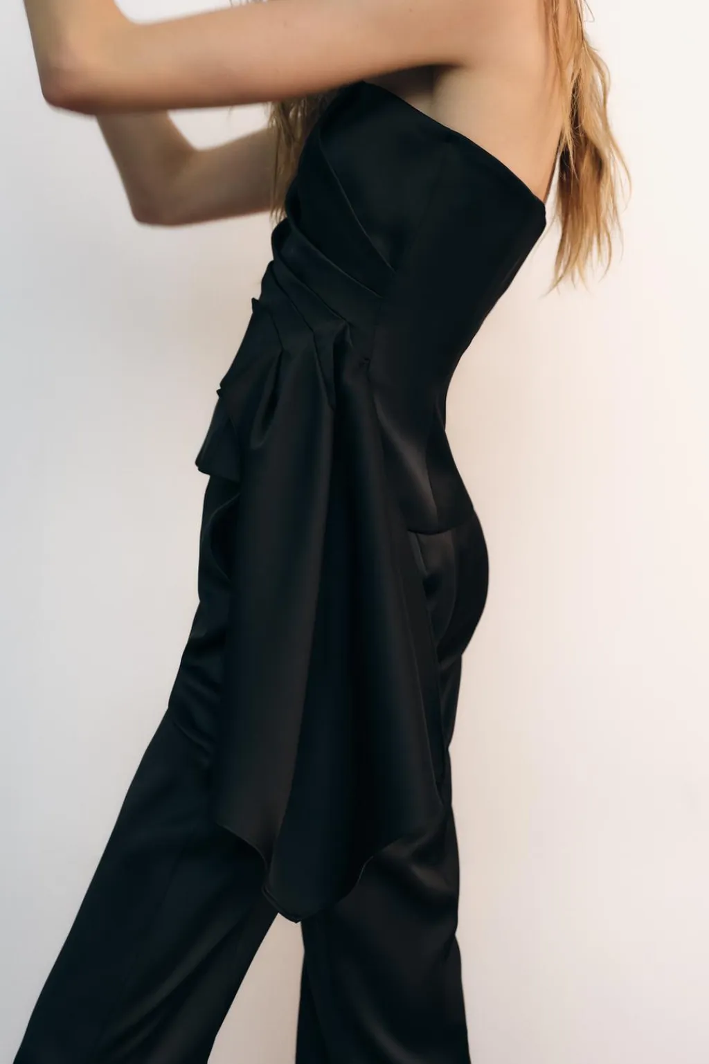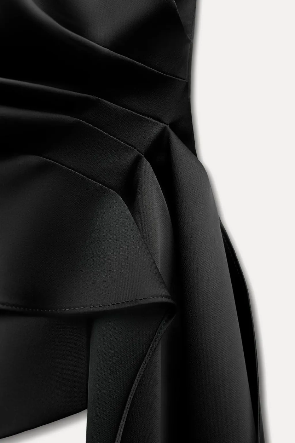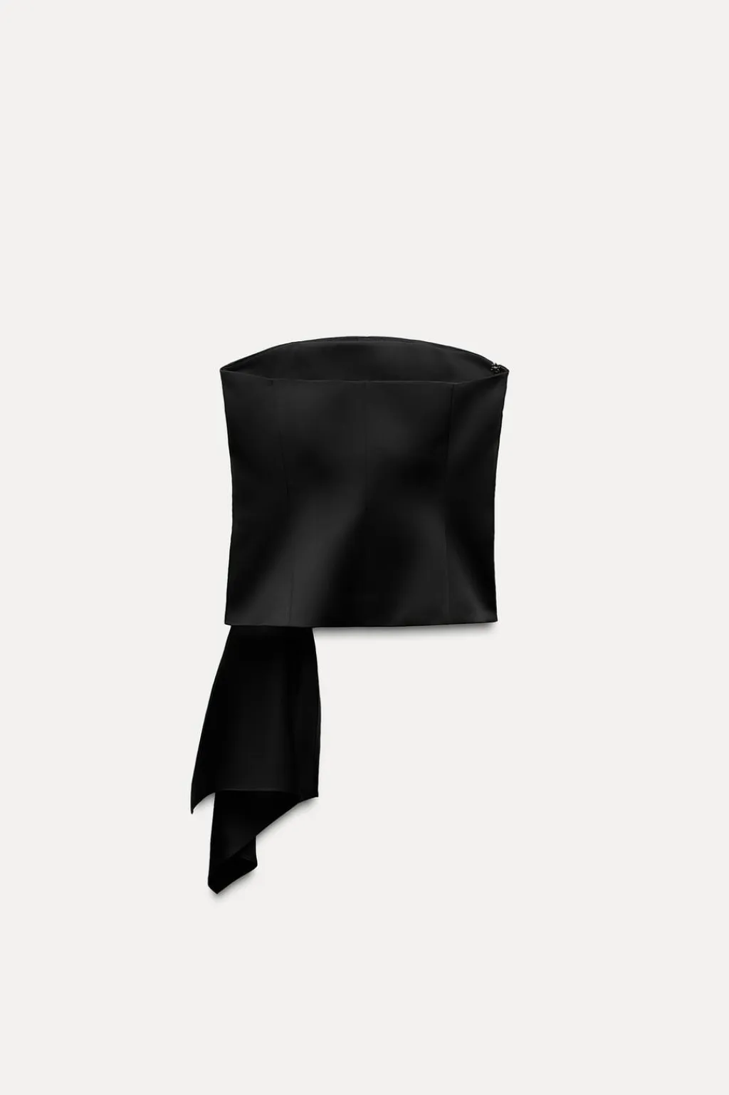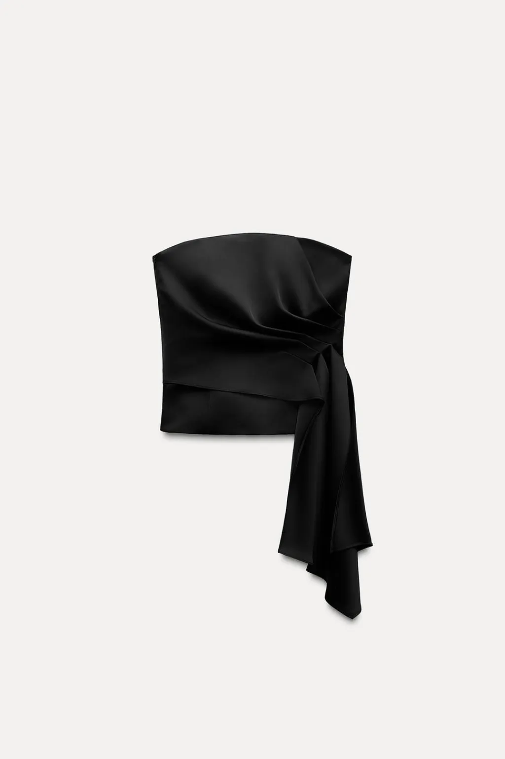 Top de escote recto y hombros descubiertos. Detalle de pliegues delanteros y bajo asimétrico. Cierre lateral con cremallera oculta en costura.