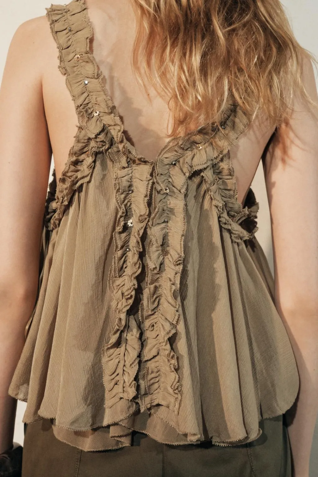 Top de escote pico y tirantes anchos. Detalle de tejido con frunces y aplicación de lentejuelas a tono. Bajo asimétrico.