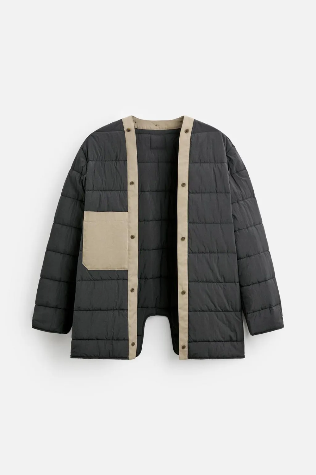Abrigo interior acolchado y desmontable. Cuello redondo y manga larga. Cierre frontal de botonadura.