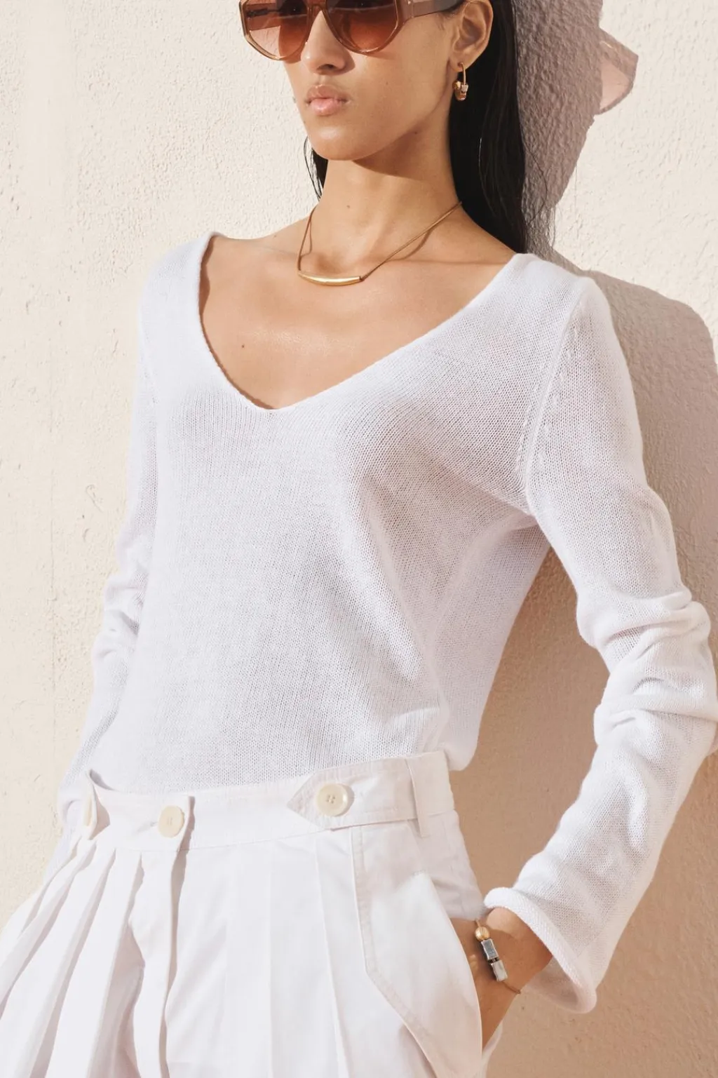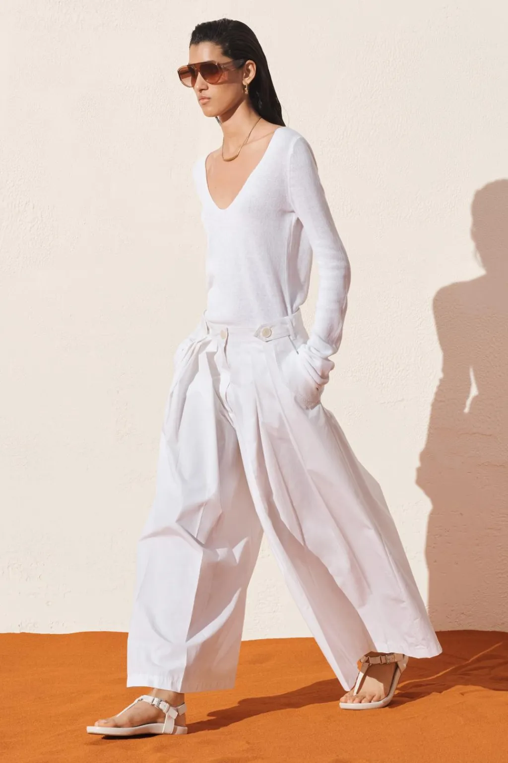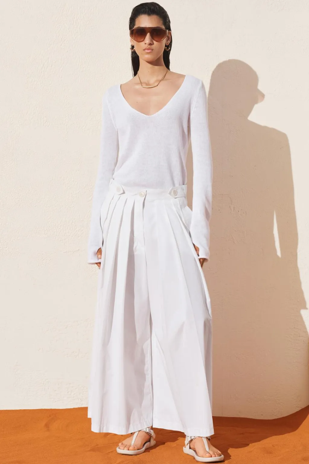 Pantalón de tiro medio confeccionado en hilatura con mezcla de algodón. Cintura con trabillas y botones. Bolsillos con solapa en delantero y de vivo en espalda. Detalle de pinzas frontales. Pierna ancha. Cierre frontal con cremallera y botón.