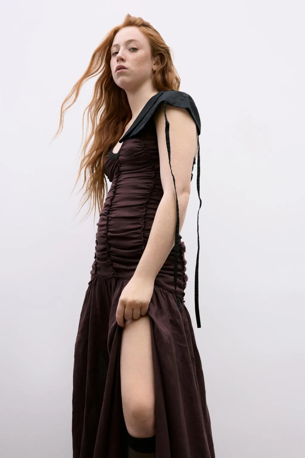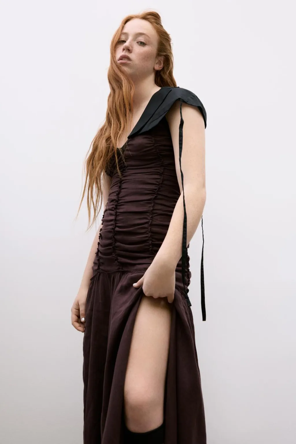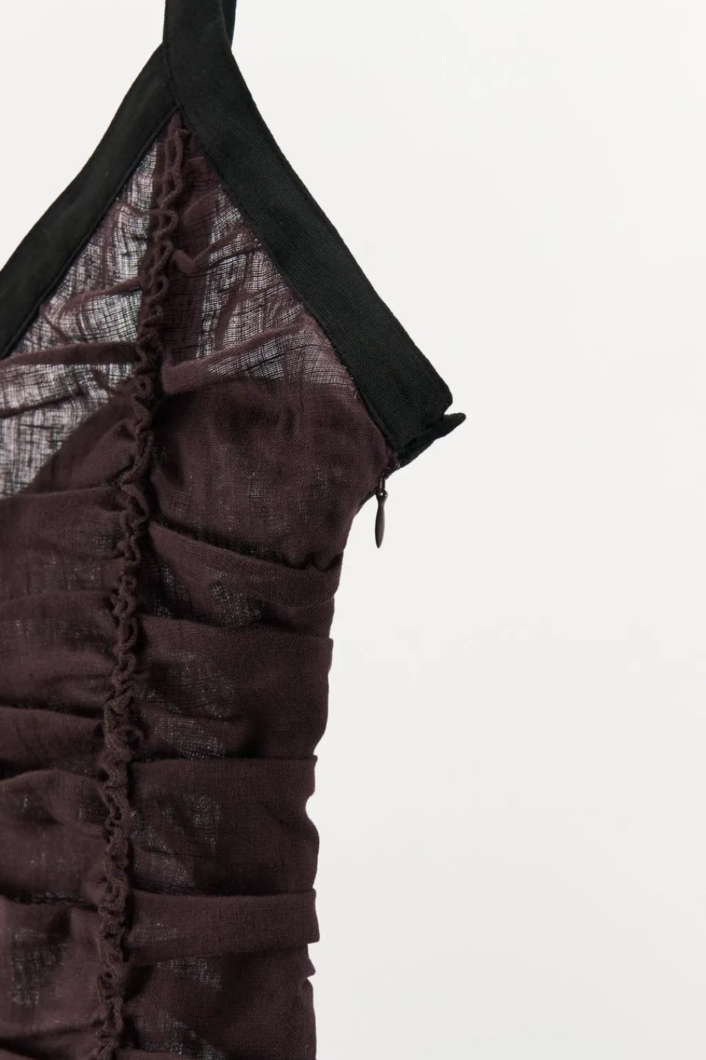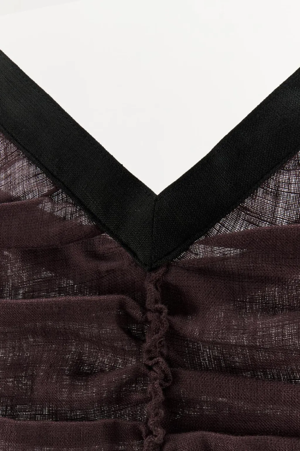 Vestido confeccionado en hilatura de lino 100%. Escote pico y tirantes anchos con aplicación de banda combinada a contraste. Detalle de tejido drapeado. Bajo con abertura frontal. Cierre con cremallera lateral oculta en costura.