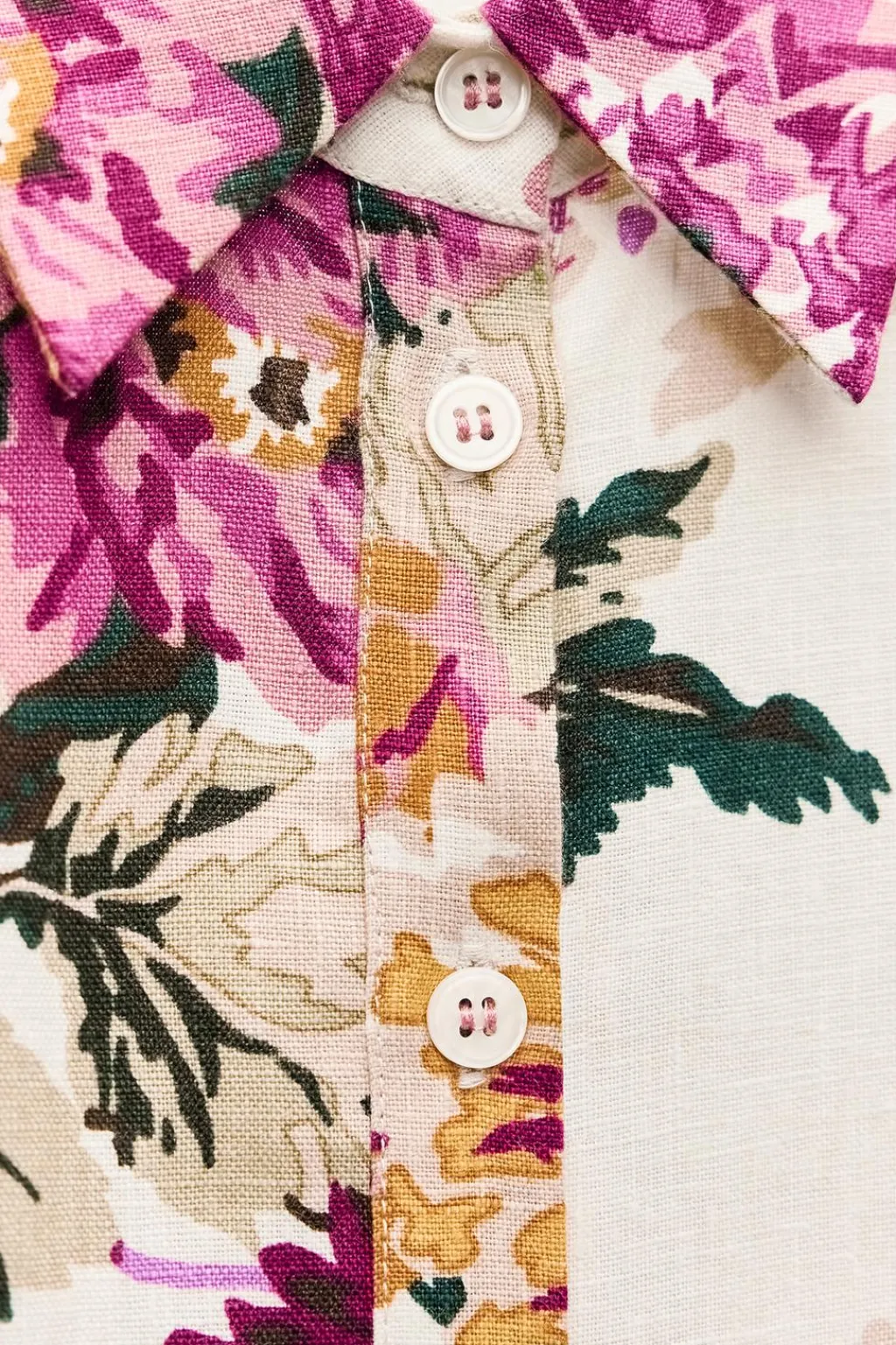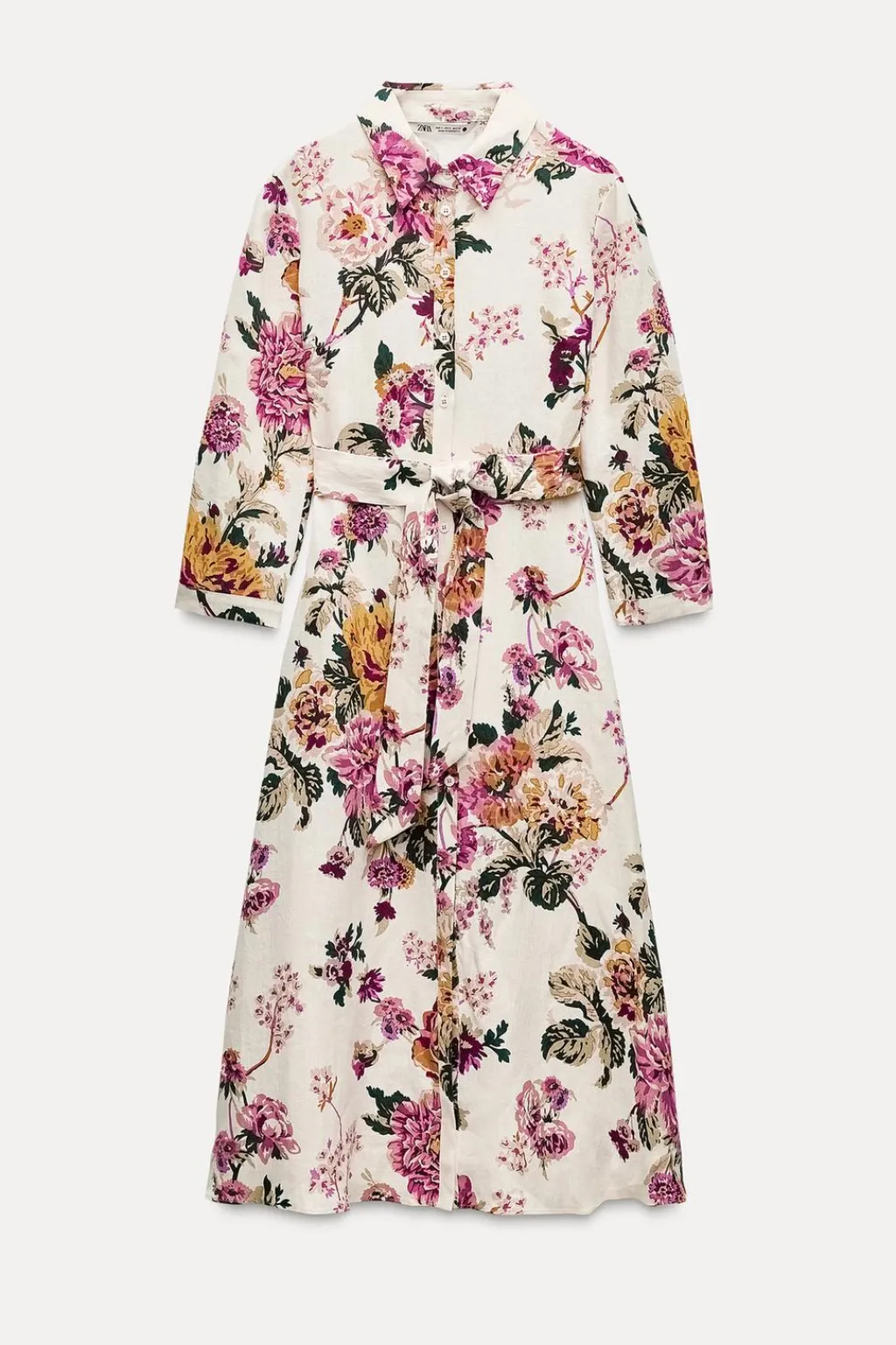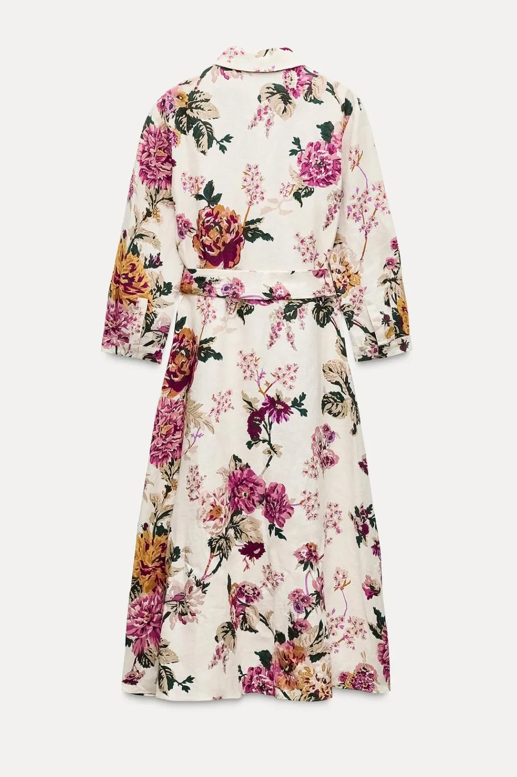 Vestido midi confeccionado en hilatura de lino 100%. Cuello solapa y manga larga acabada en puño. Cinturón en mismo tejido ajustable con lazadas. Cierre frontal con botones.