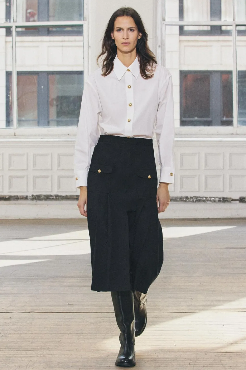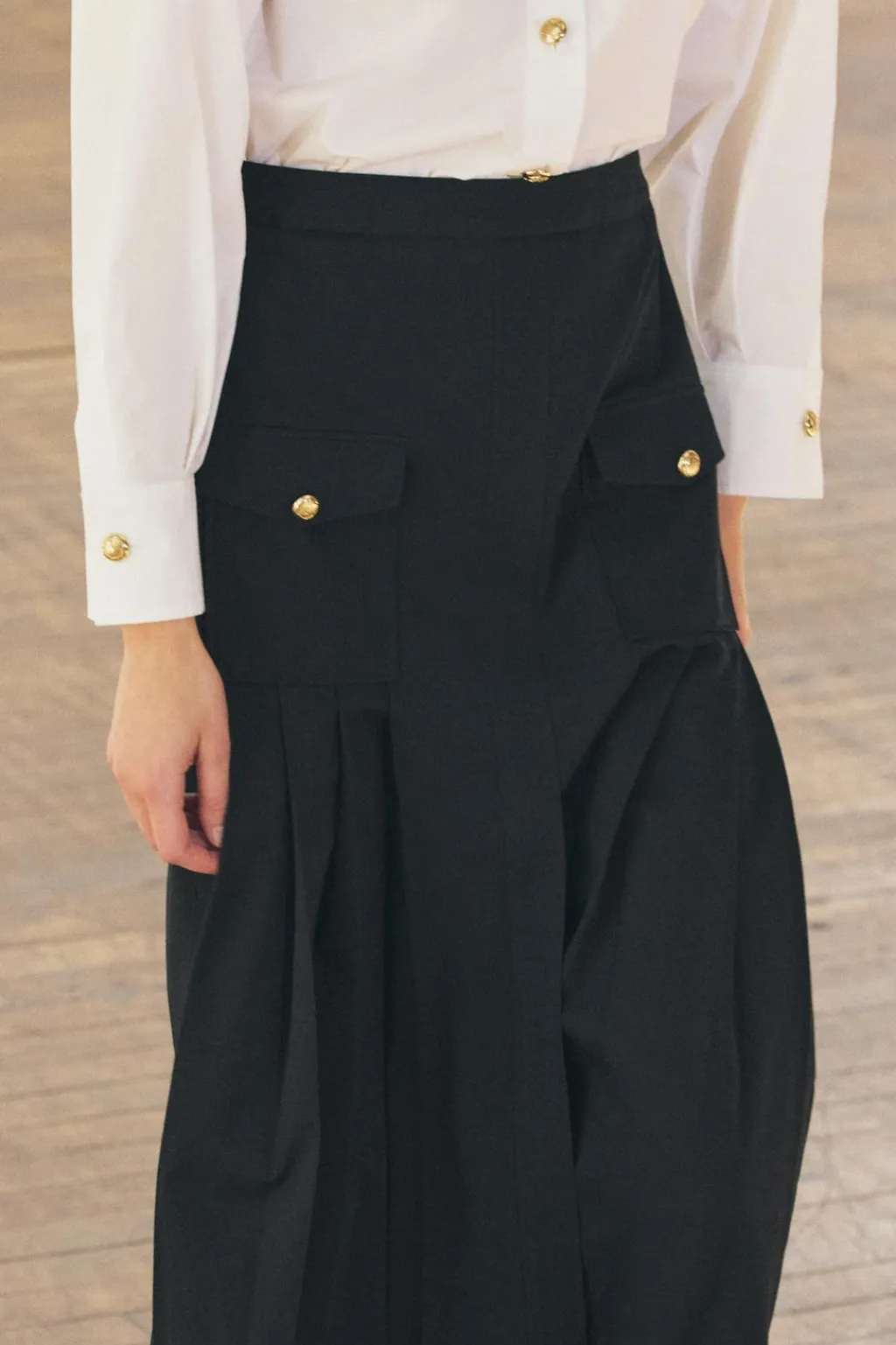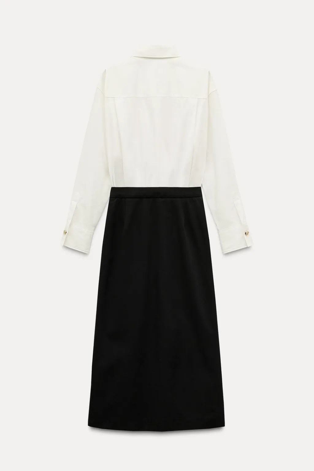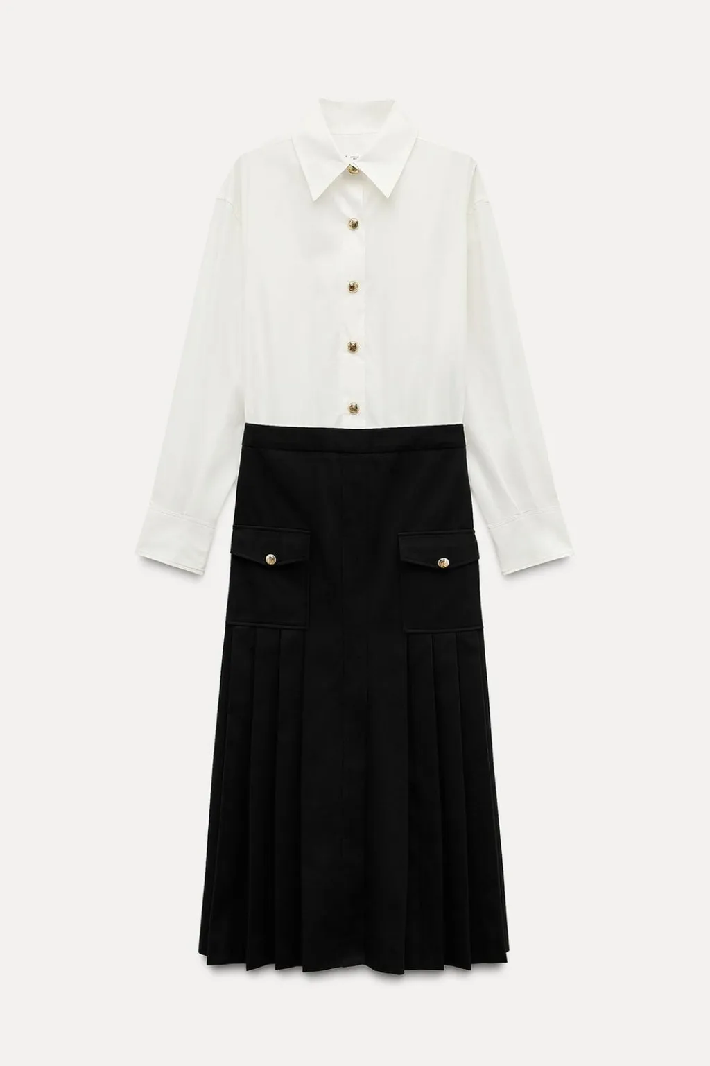 Vestido midi con cuello solapa y manga larga acabada en puño con abertura y botón. Falsos bolsillos con solapa y botón en delantero. Bajo acabado en tablas con abertura. Cierre frontal con botones metálicos en relieve.