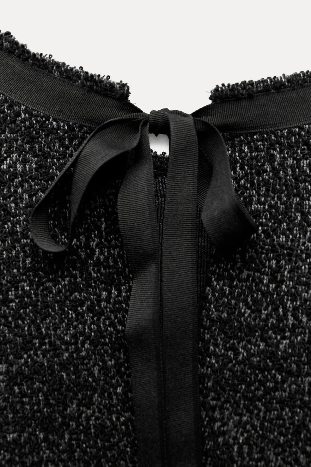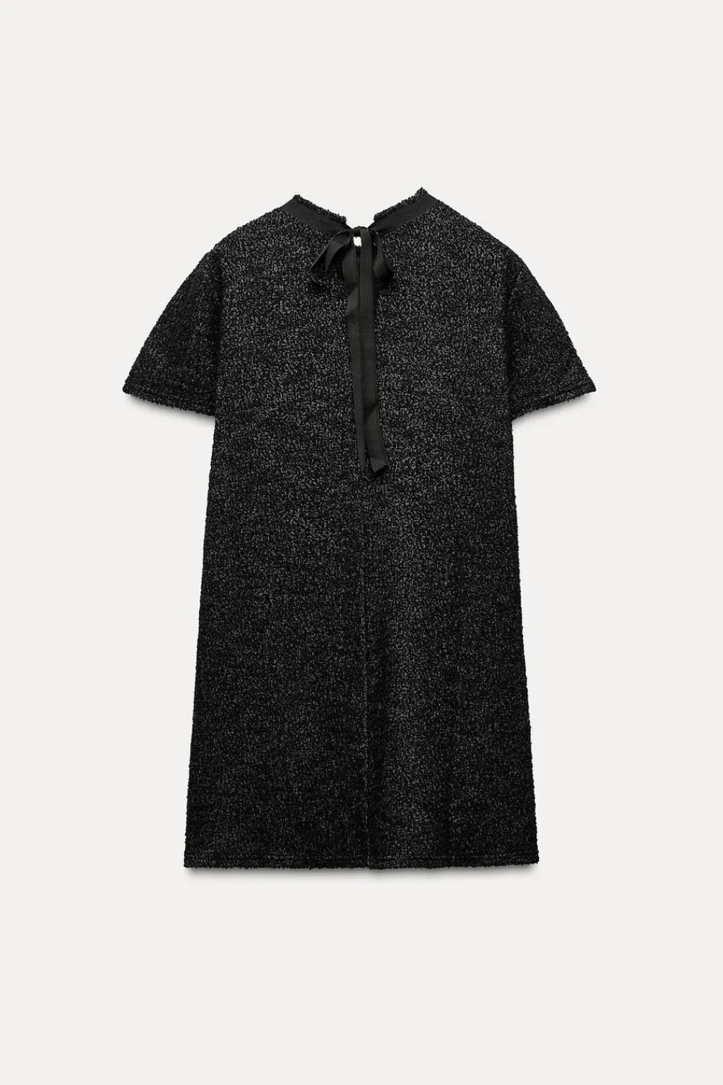 Vestido corto de cuello redondo y manga corta. Detalle de tejido con estructura. Cierre en espalda con abertura y lazadas.