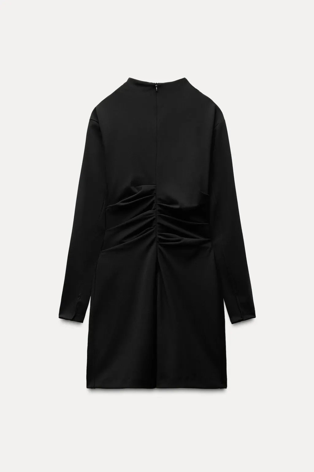 Vestido corto de cuello subido y manga larga acabada en abertura y botón. Detalle de pliegues. Cierre en espalda con cremallera oculta en costura.