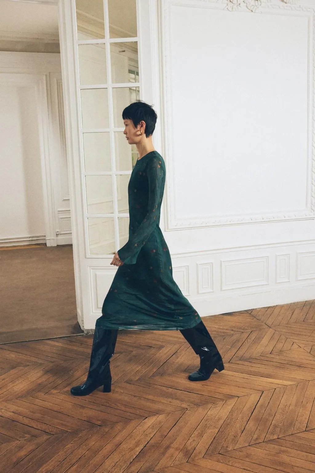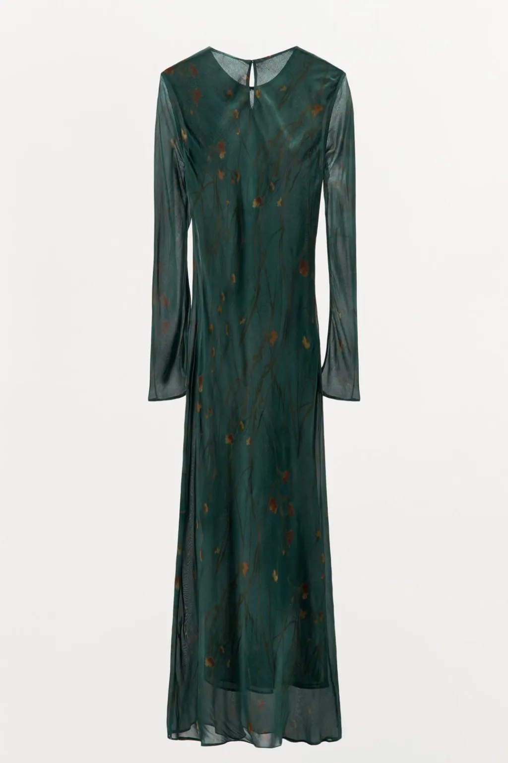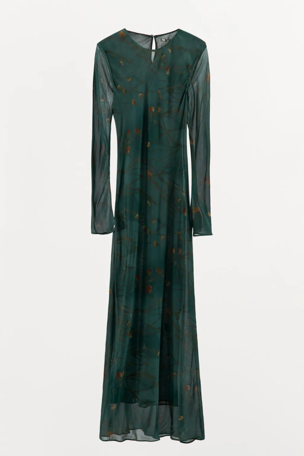 Vestido largo confeccionado en hilatura de viscosa 100%. Cuello redondo y manga larga acabada en línea evasé. Forro interior combinado a contraste. Cierre en espalda con botón.