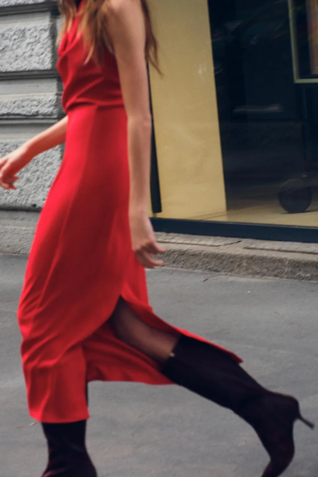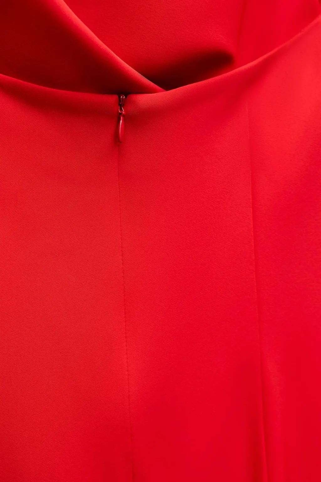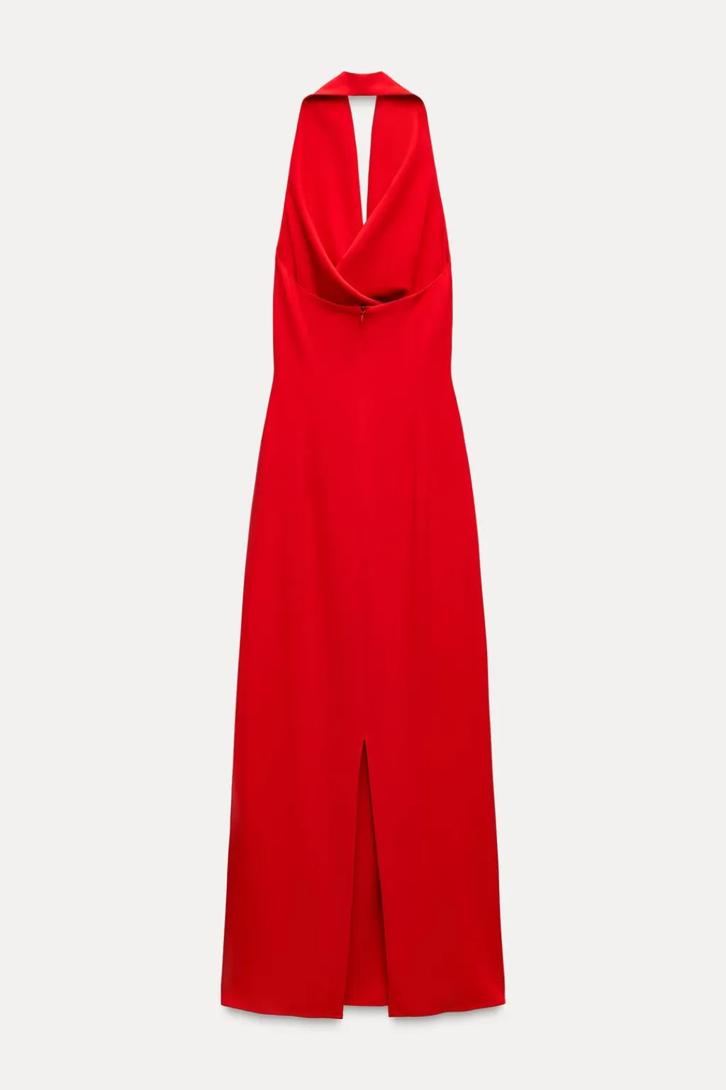 Vestido de cuello fluido y halter con espalda descubierta. Bajo con abertura trasera. Cierre en espalda con cremallera oculta en costura.