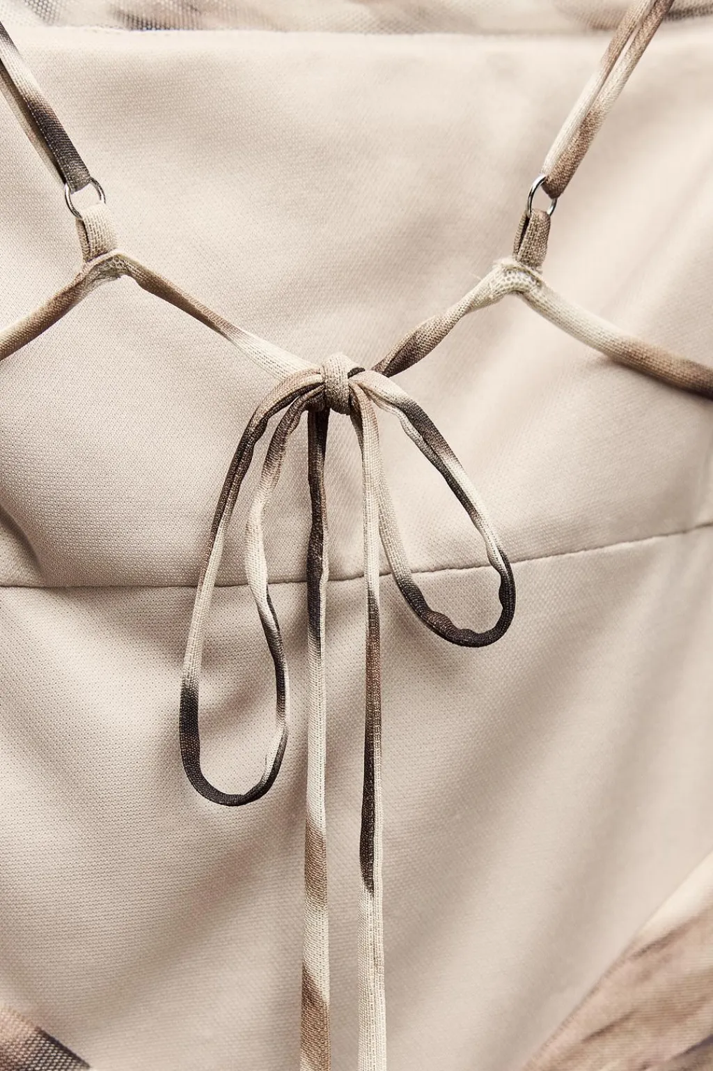 Vestido midi de escote recto y tirantes finos ajustables. Detalle de lazada en espalda. Tejido drapeado. Forro interior. Cierre en espalda con cremallera oculta en costura.