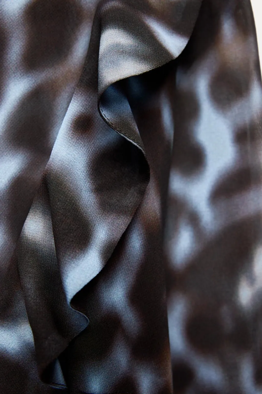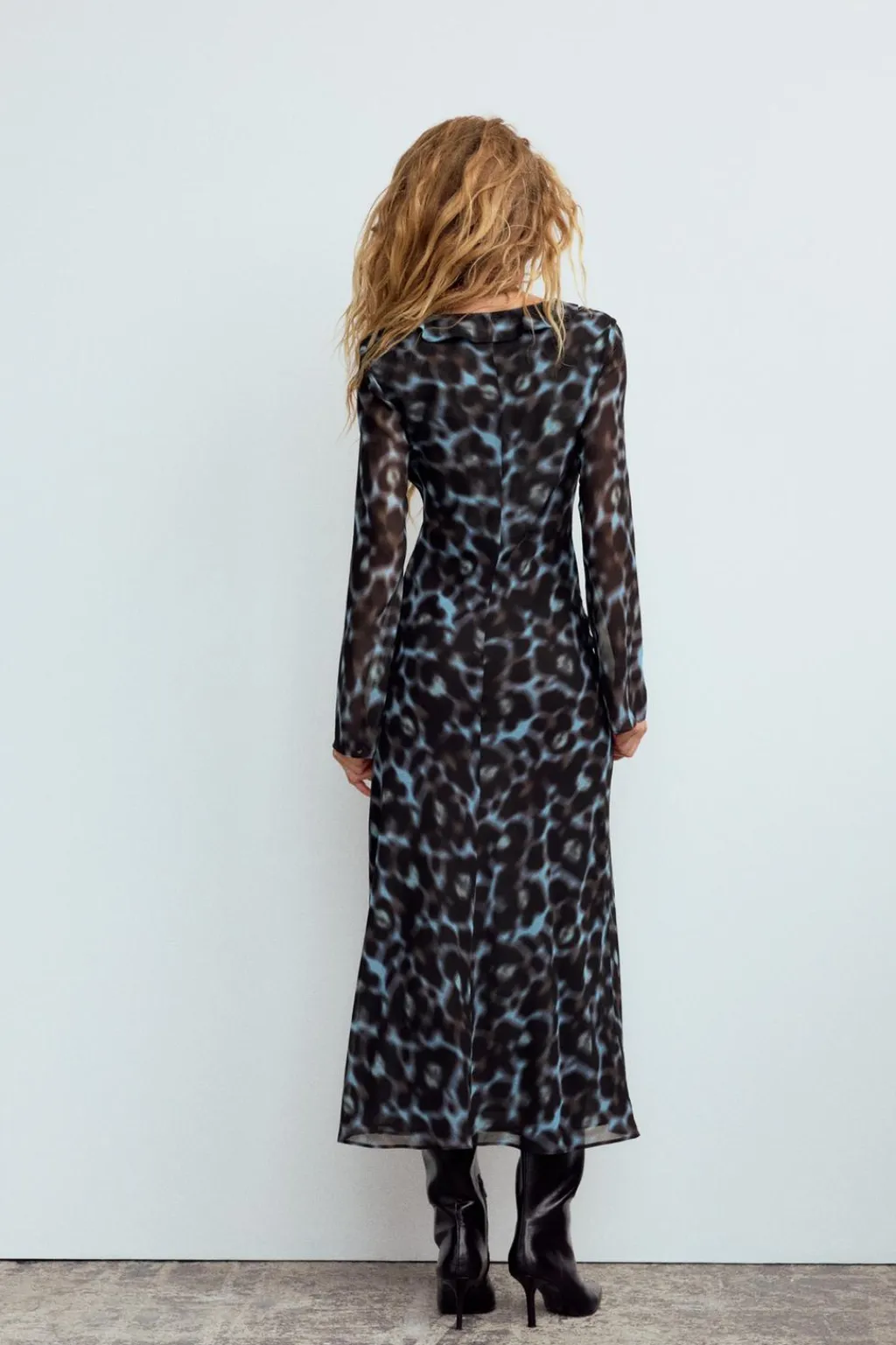 Vestido midi de escote pico pronunciado con volantes y lazada. Manga larga semitransparente. Forro interior.