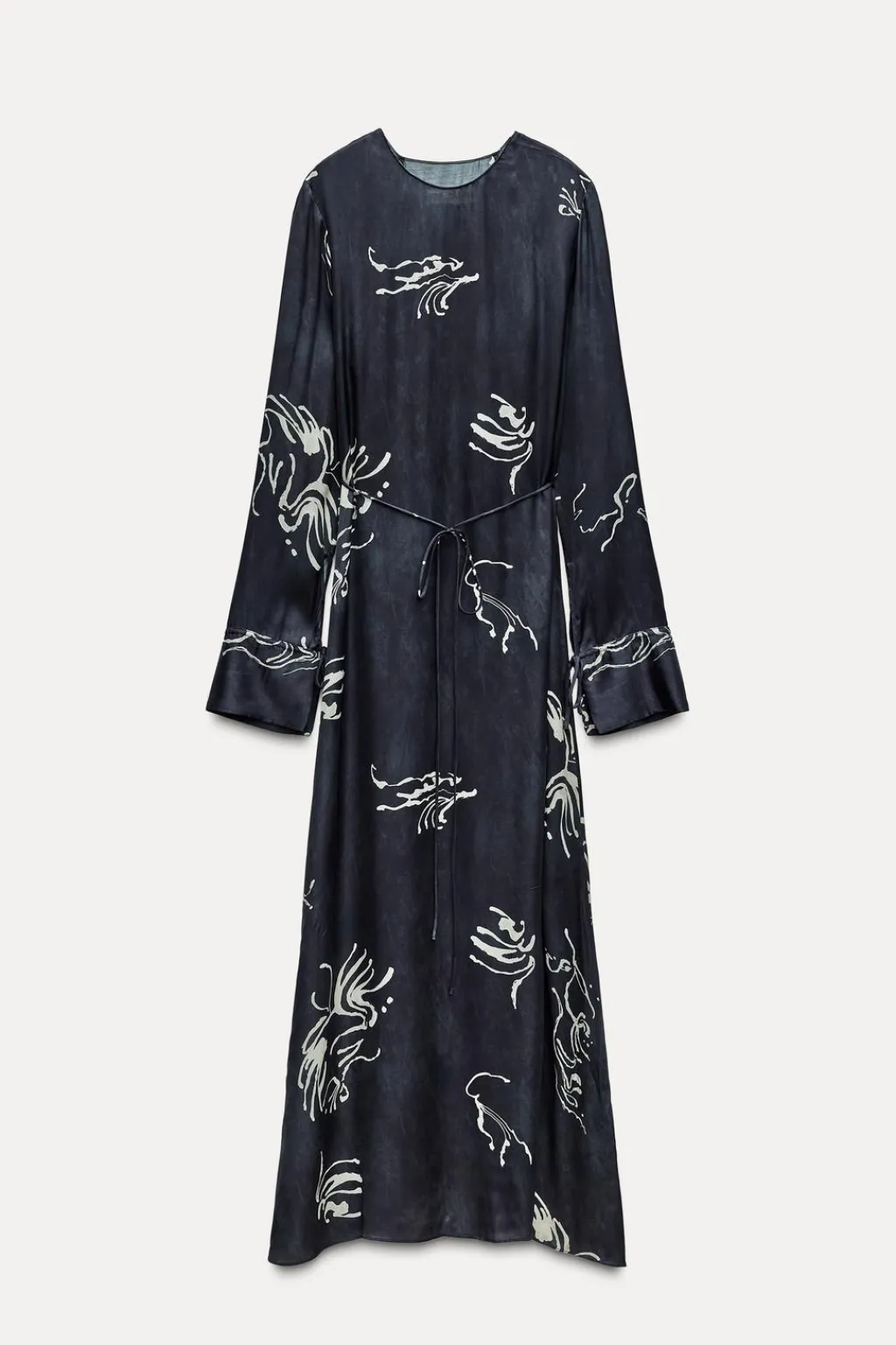 Vestido midi confeccionado en hilatura de viscosa 100%. Cuello redondo y manga larga acabada en puño Cinturón en mismo tejido ajustable con lazadas. Bajo asimétrico.