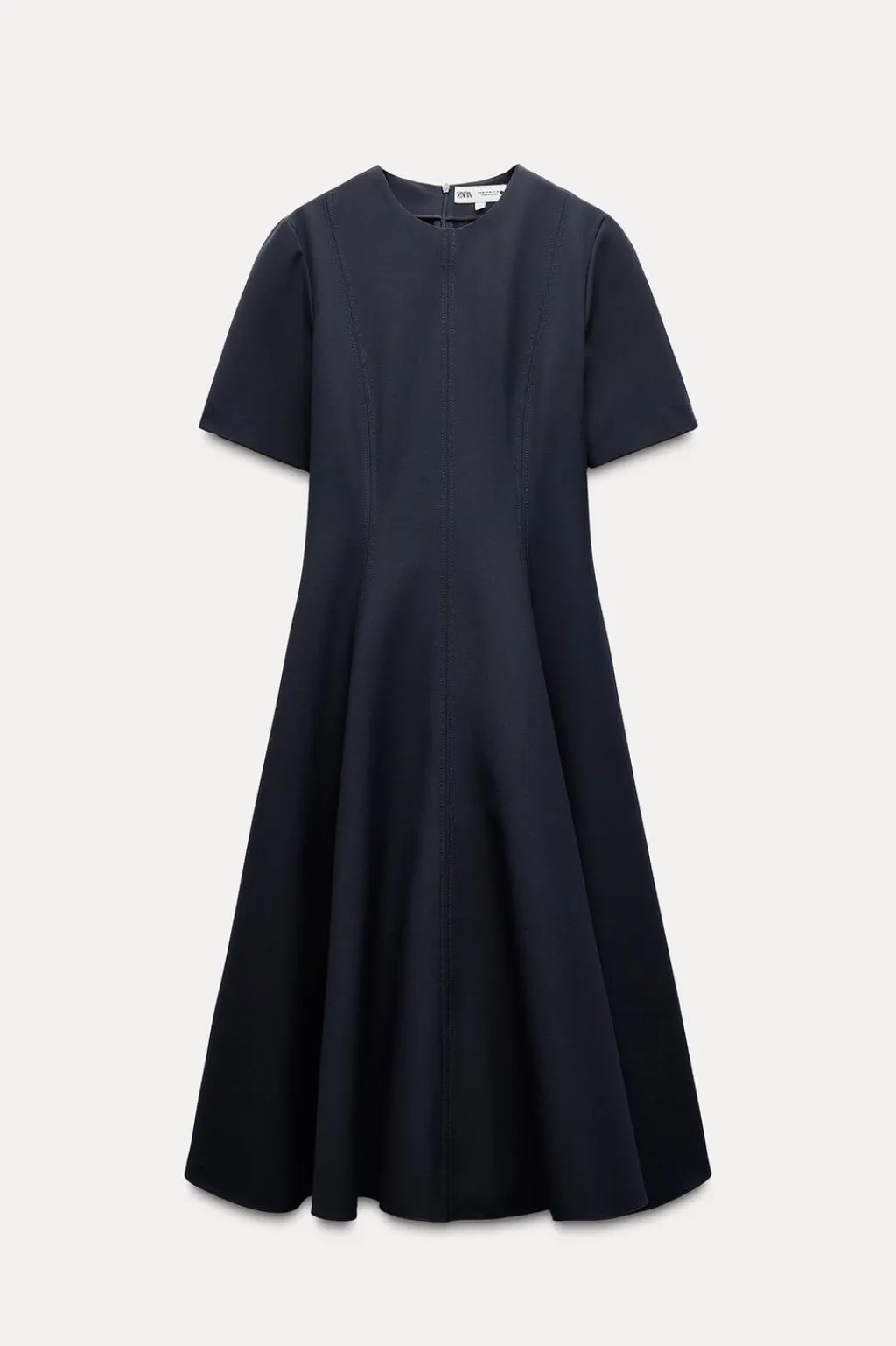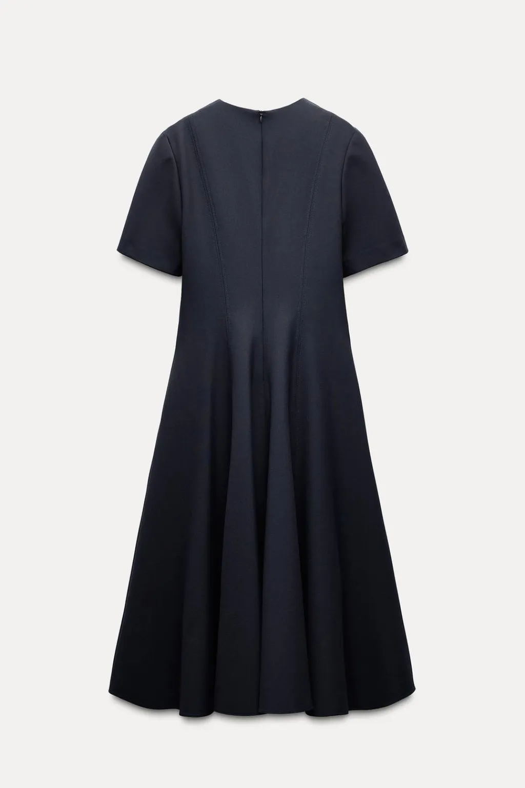 Vestido midi confeccionado en hilatura con viscosa 29%. Cuello redondo y manga corta. Bajo acabado en godets. Cierre en espalda con cremallera oculta en costura.