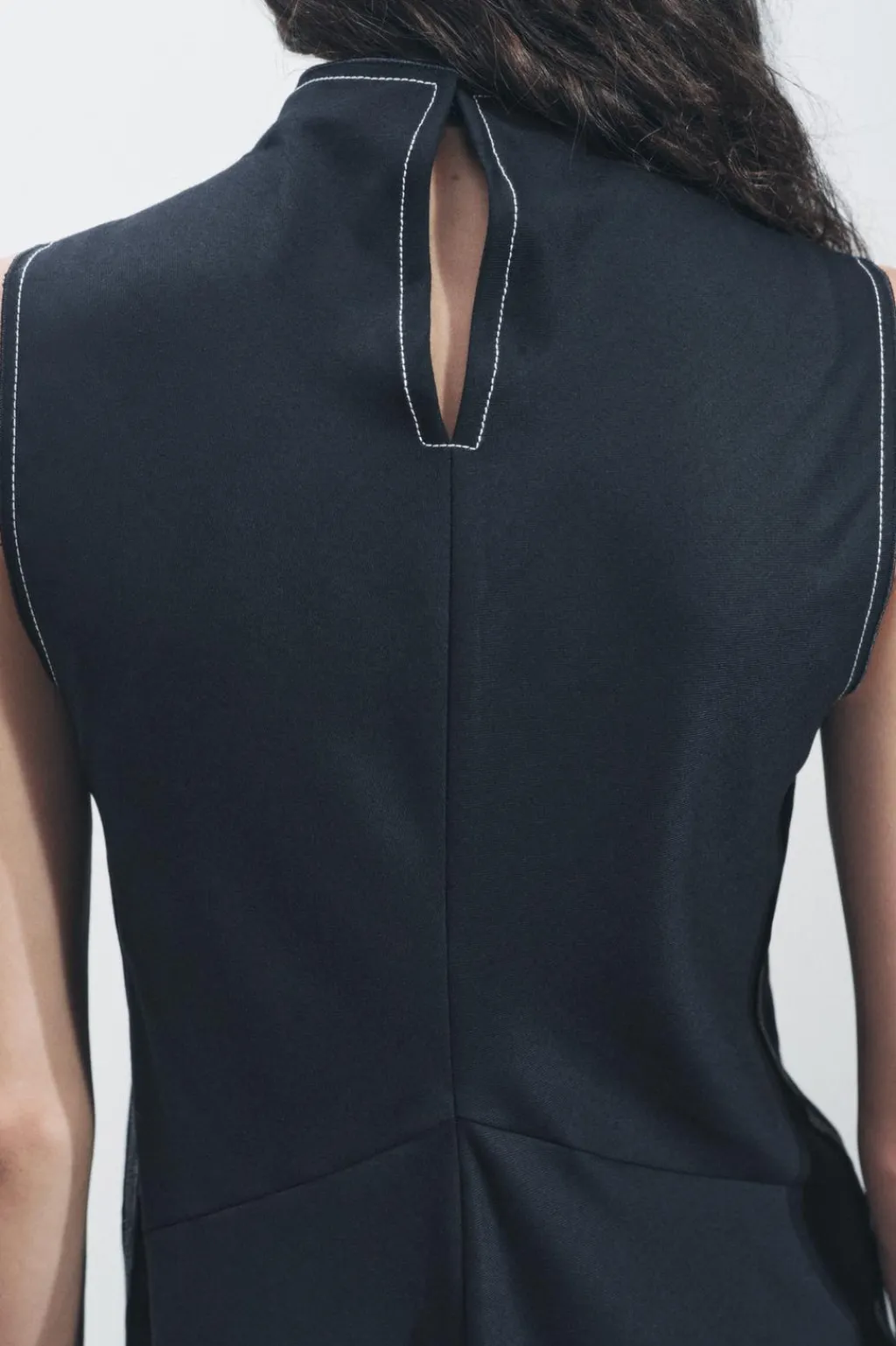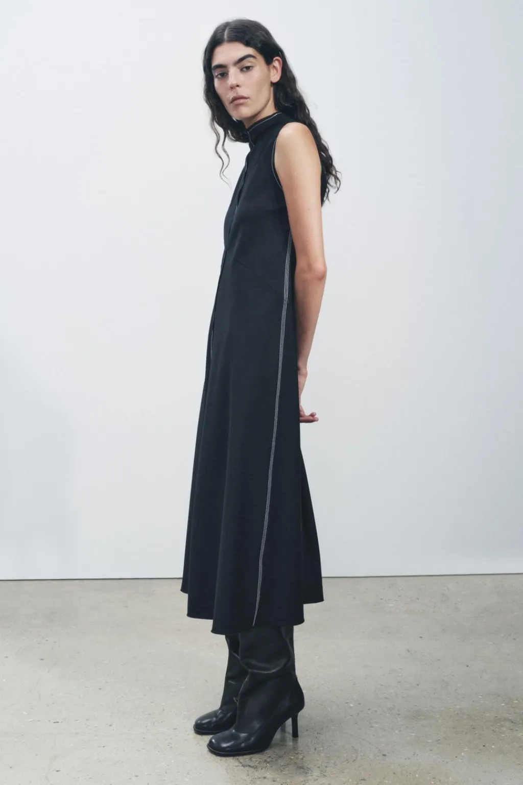 Vestido midi confeccionado en hilatura con viscosa. Cuello perkins y manga sisa. Detalle de pespuntes a contraste. Cierre en espalda con abertura y botón.