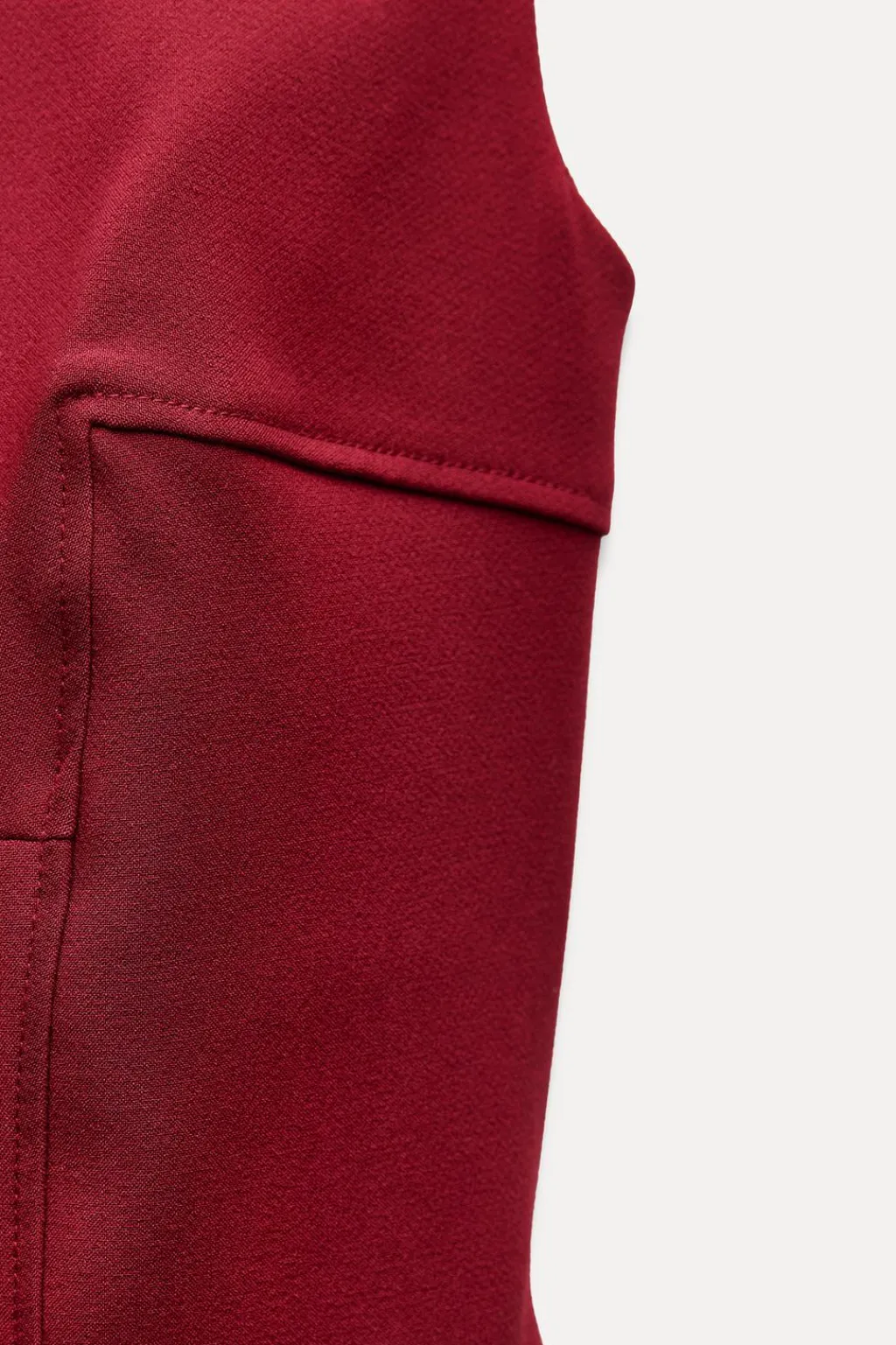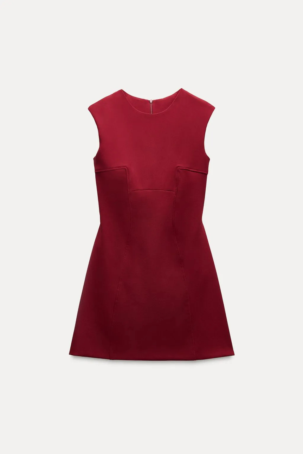 Vestido de cuello redondo y manga sisa. Detalle de costuras marcadas. Cierre en espalda con cremallera oculta en costura.