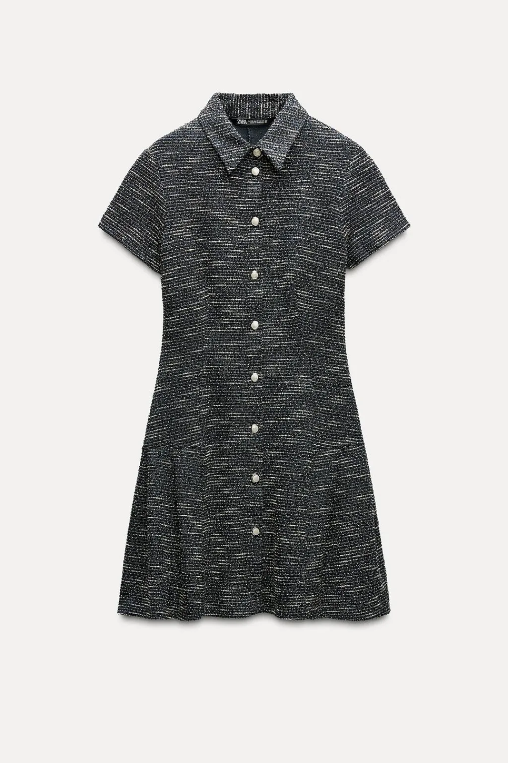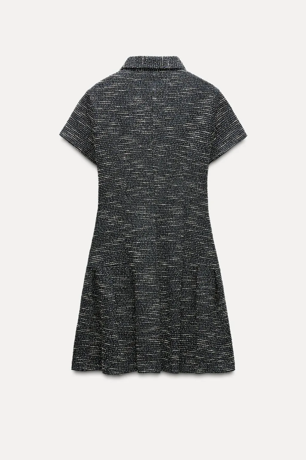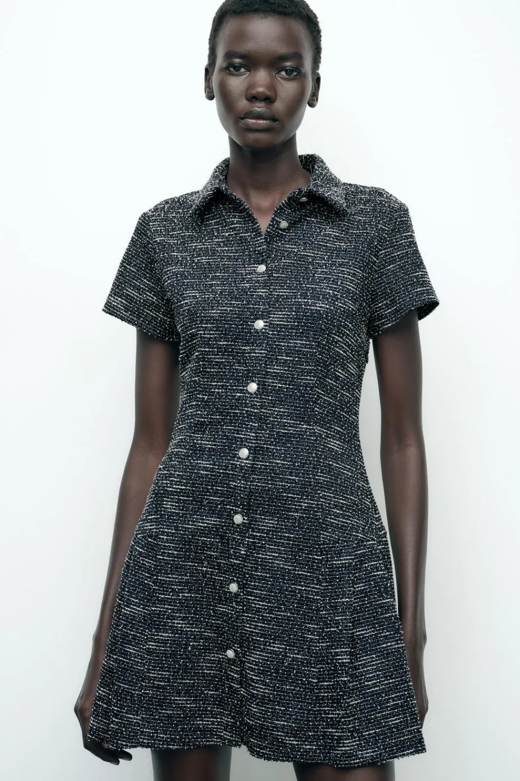 Vestido de cuello solapa y manga corta. Bajo acabado con pliegues. Cierre frontal con botones.