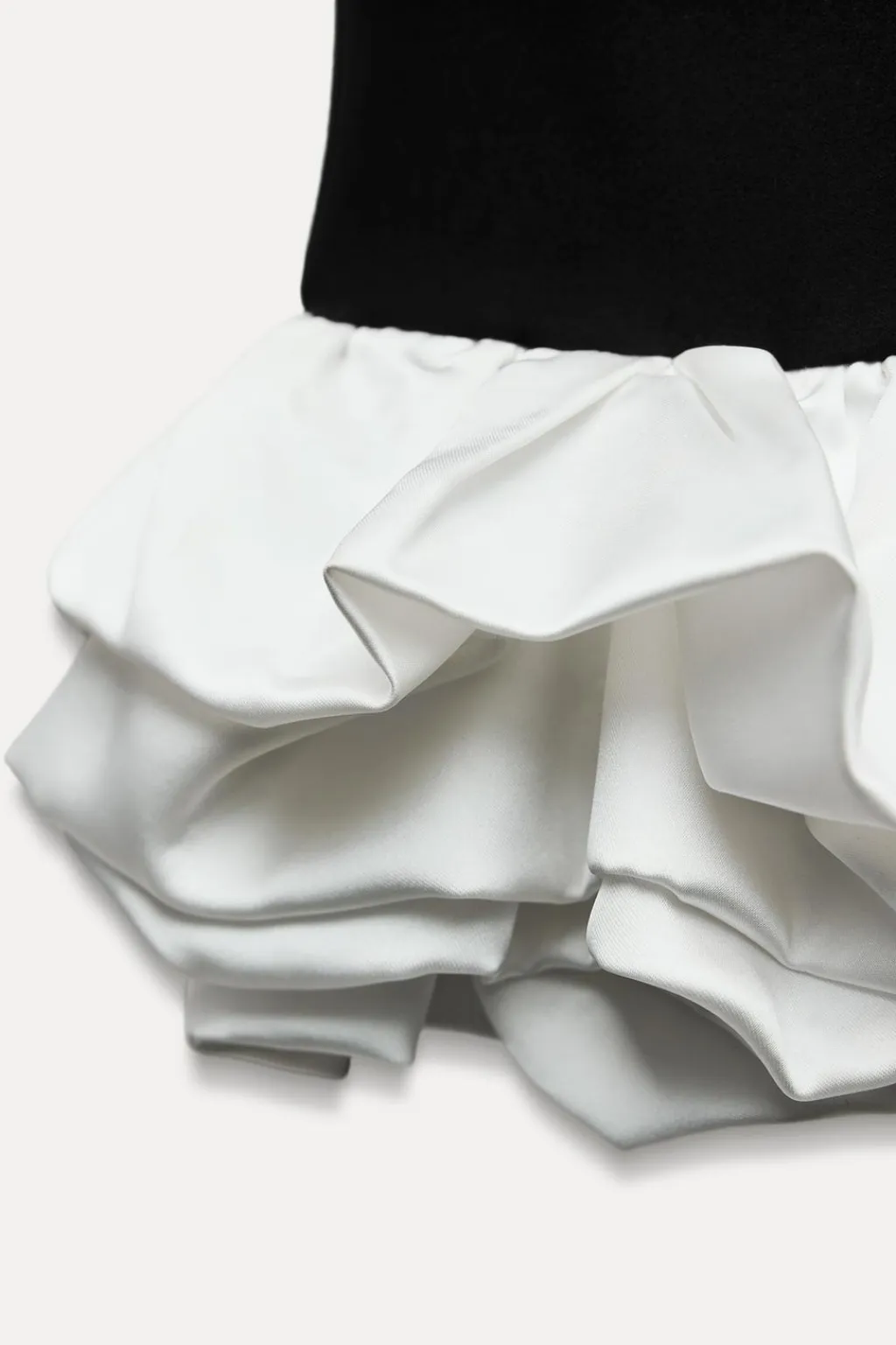 Vestido mono de cuello barco y tirantes. Bajo combinado a contraste en tejido satinado con volantes. Cierre en espalda con cremallera oculta en costura.