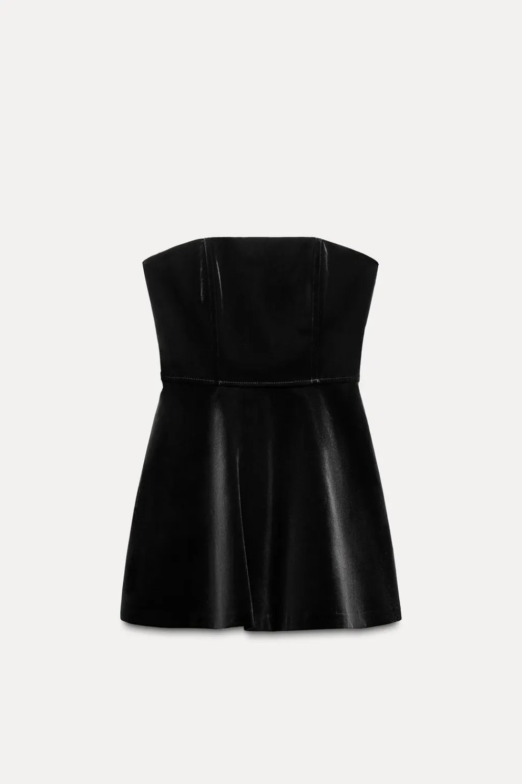 Vestido mono de escote recto y hombros descubiertos. Forro interior tipo shorts. Cierre en espalda con cremallera oculta en costura.