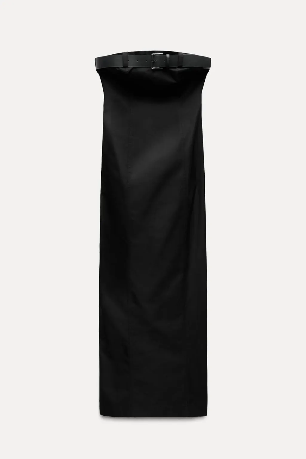 Vestido tubo palabra de honor con hombros descubiertos. Cinturón a tono ajustable con hebilla. Cierre con cremallera oculta en costura.