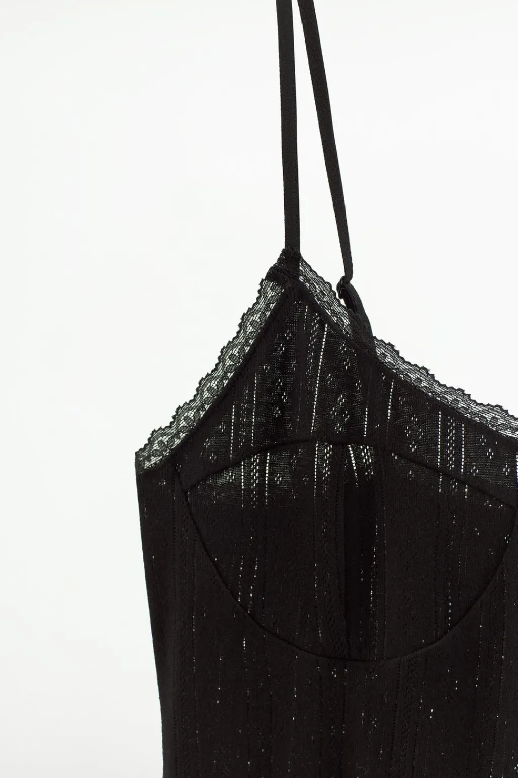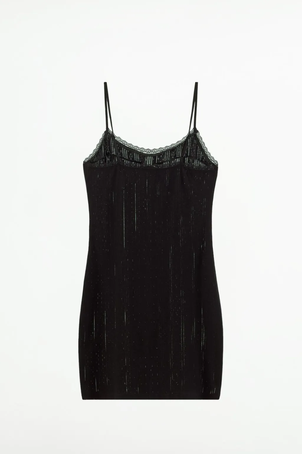 Vestido midi confeccionado en hilatura de algodón 100%. Escote redondo y tirantes finos ajustables. Detalle de costuras marcadas en pecho. Acabados en puntilla.