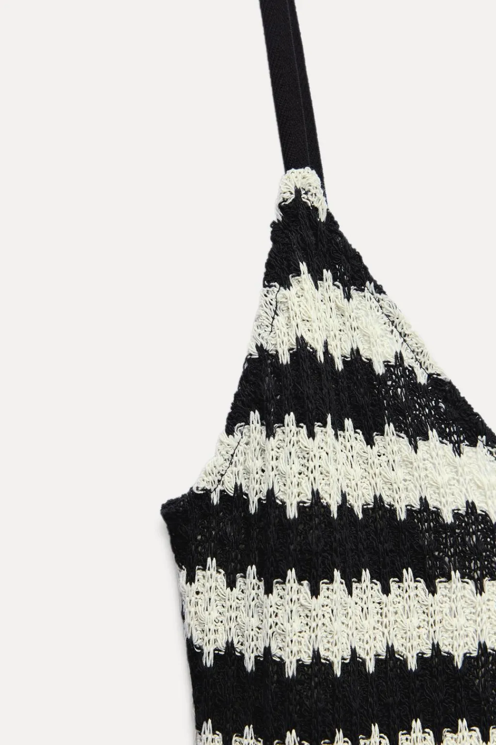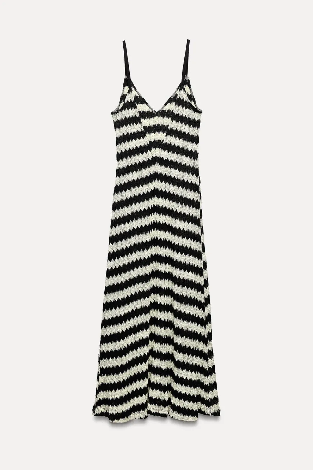 Vestido confeccionado en hilatura con algodón. Escote pico y tirantes anchos. Bajo acabado en línea evasé.