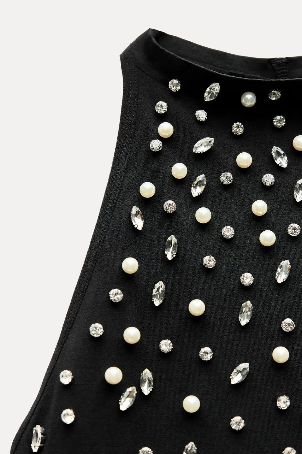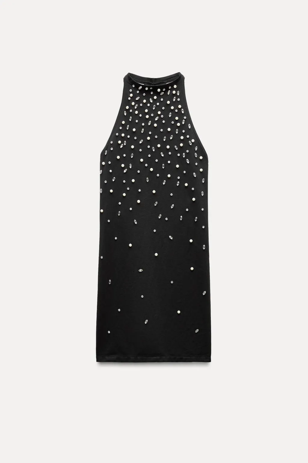 Vestido entallado de cuello halter. Tirantes en espalda. Detalle de aplicación joyas.