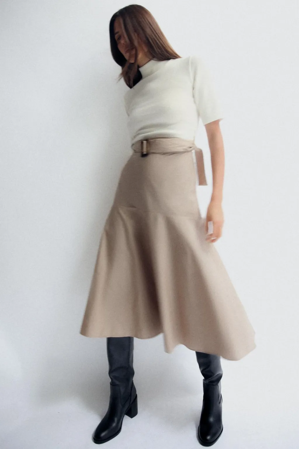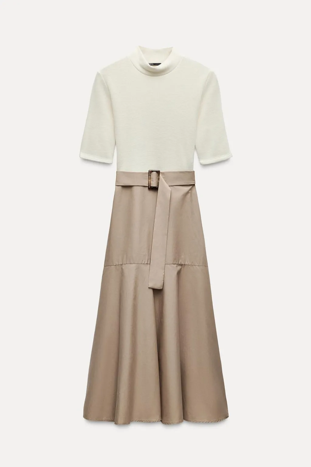 Vestido midi de cuello perkins y manga corta. Cinturón ajustable con hebilla. Detalle de combinación de tejidos a tono. Bajo acabado en línea evasé.