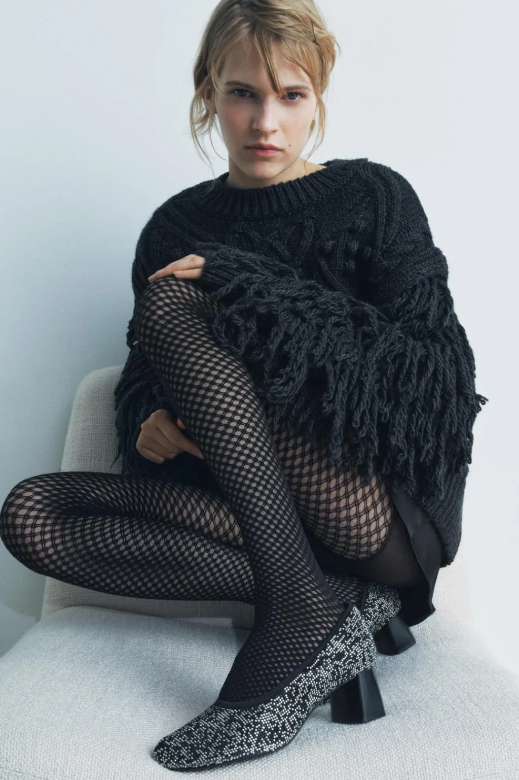 Zapato tacón con cuerpo en apliques brillantes. Escote redondo. Tacón ancho. Acabado en punta redonda.