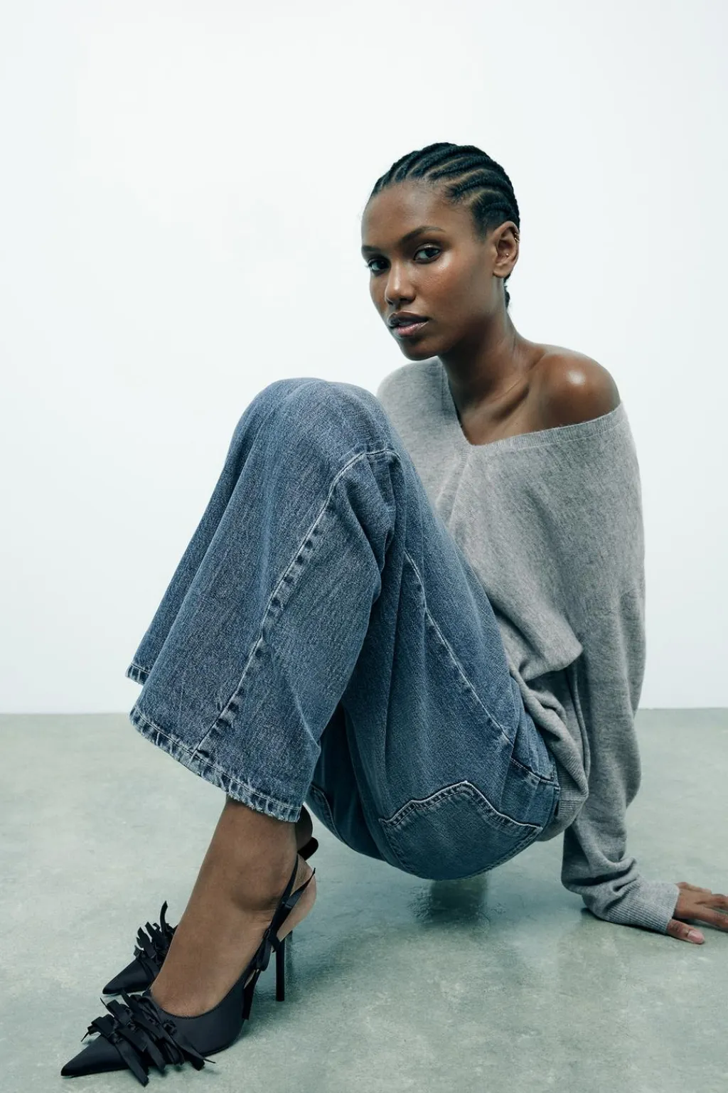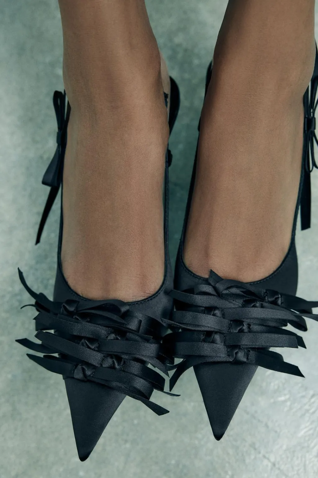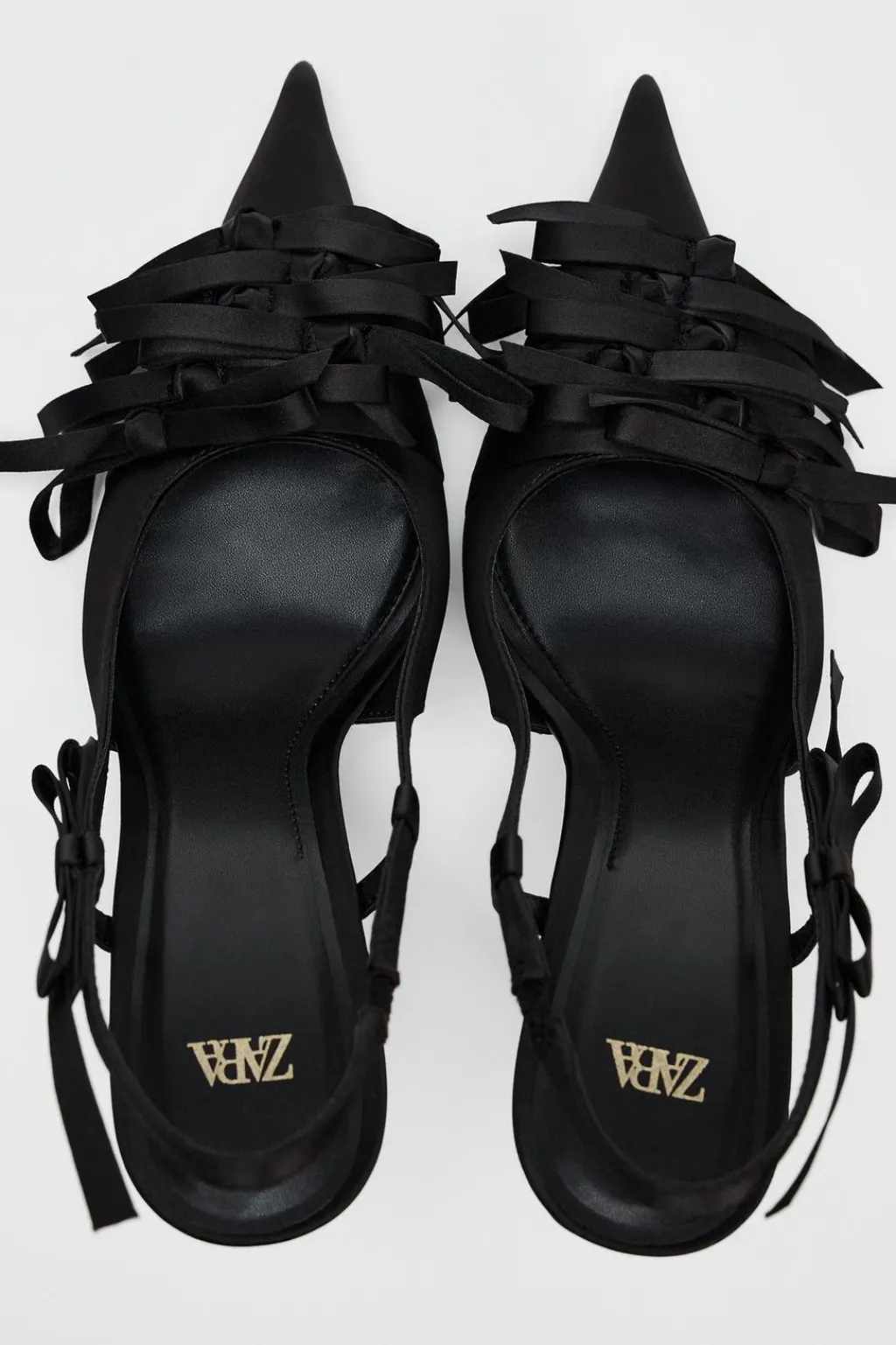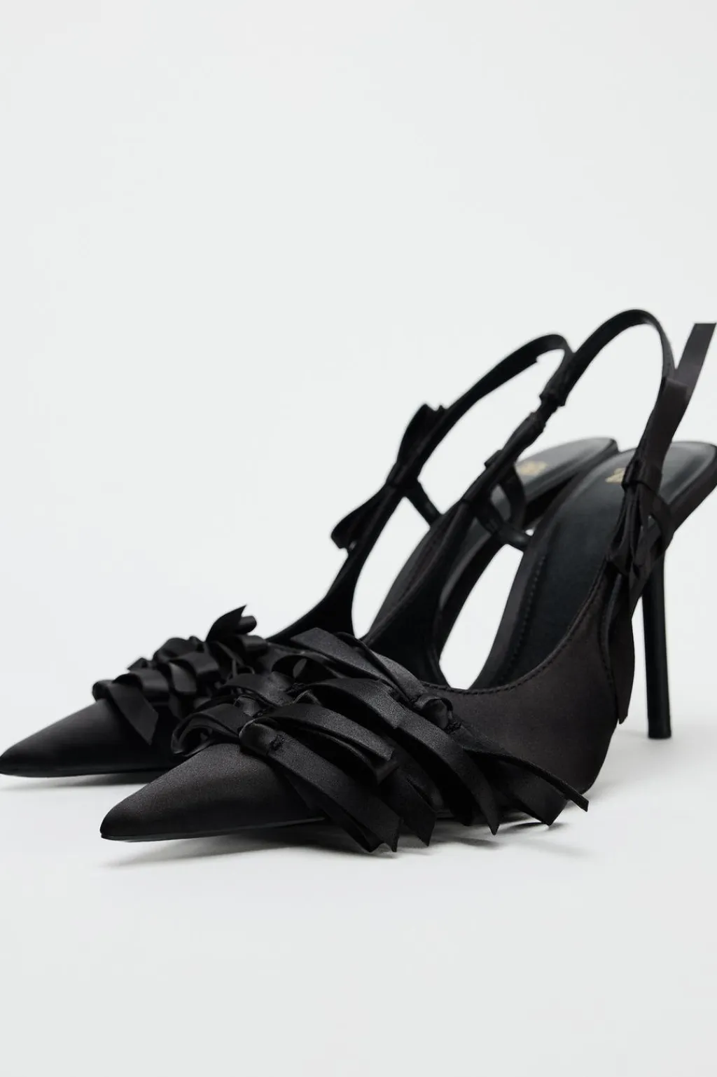 Zapato destalonado efecto satinado. Tacón fino. Detalle de multi lazos en la parte delantera. Tira trasera con hebilla al tobillo. Acabado en punta.