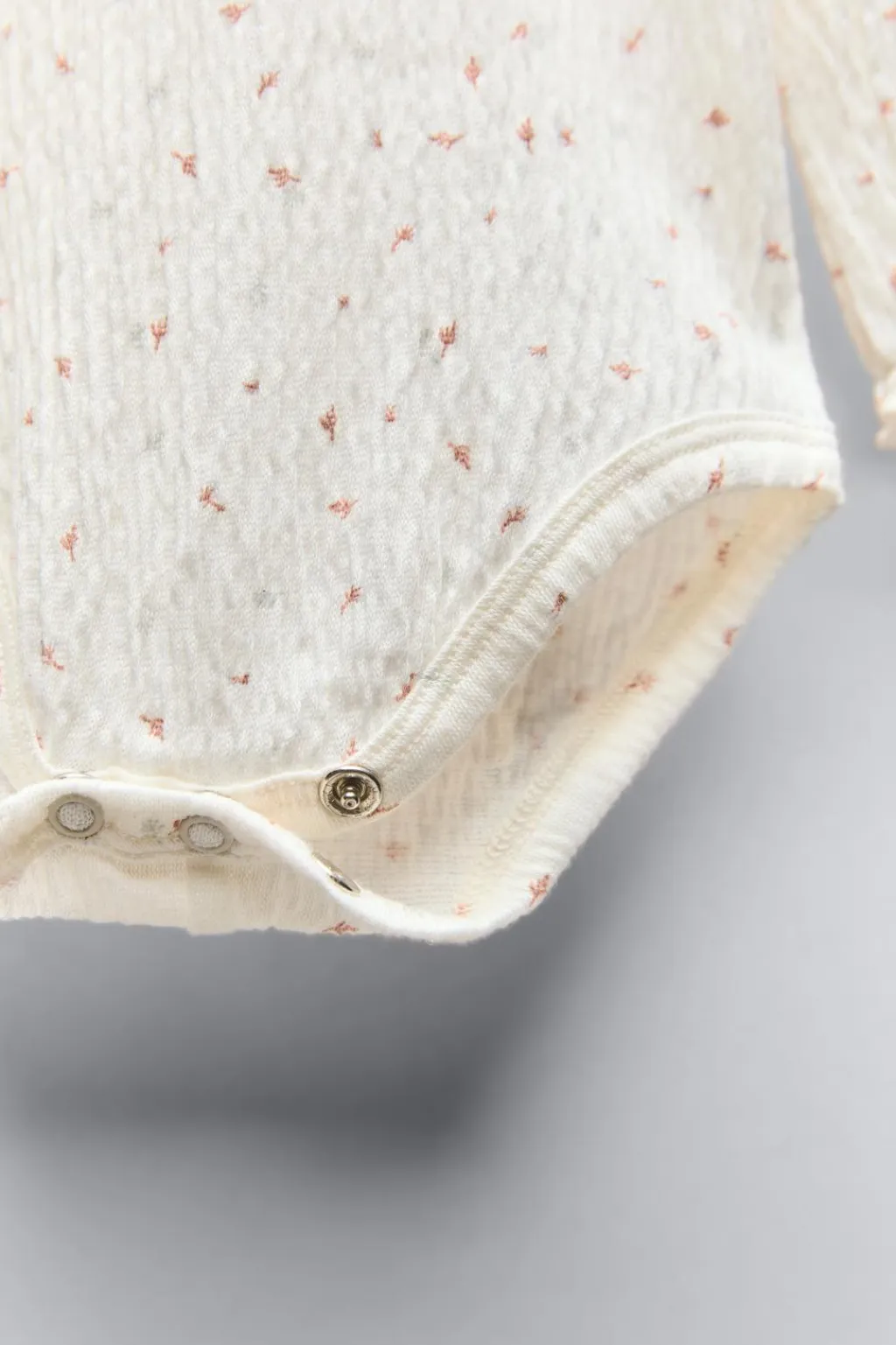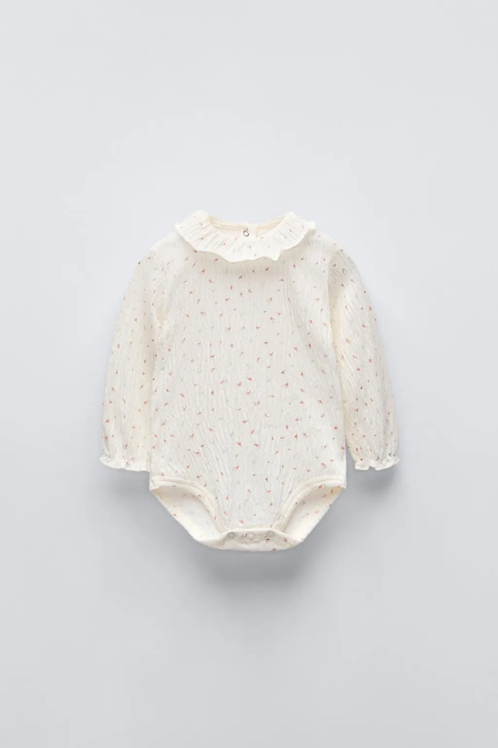 Body con cuello redondo y manga larga acabada en goma. Aplique volante en cuello. Cierre con botones tipo presión en espalda y bajo.
