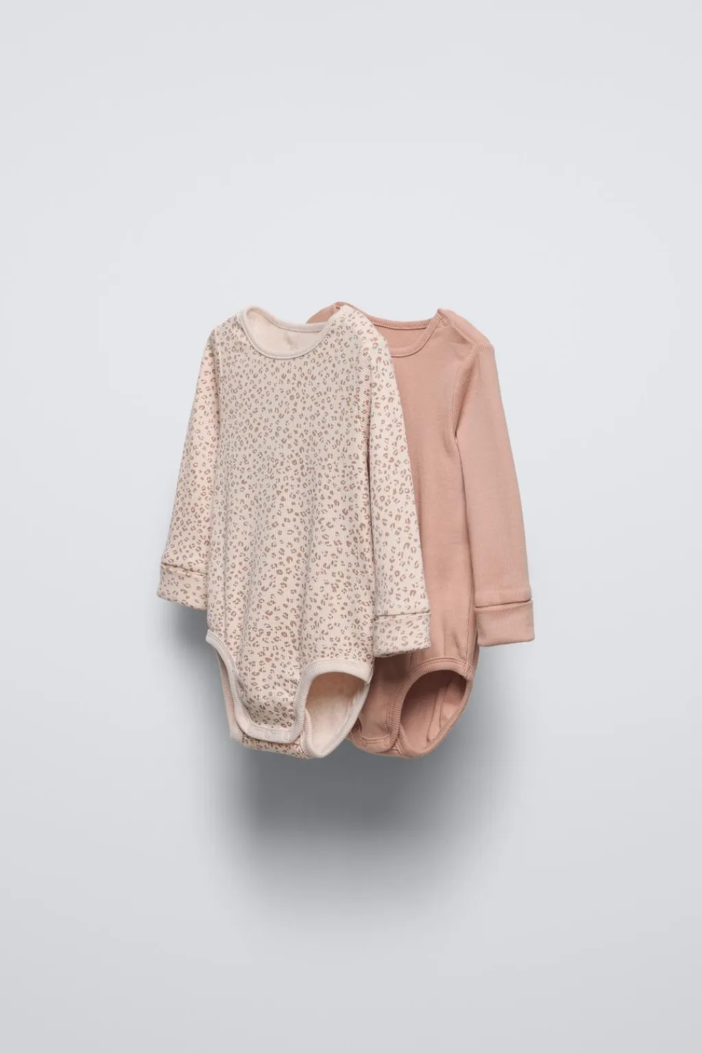 Pack de dos bodies con cuello redondo y manga larga ajustable. Cierre botones de tipo presión en hombro y en bajo ajustables para el crecimiento del bebé.