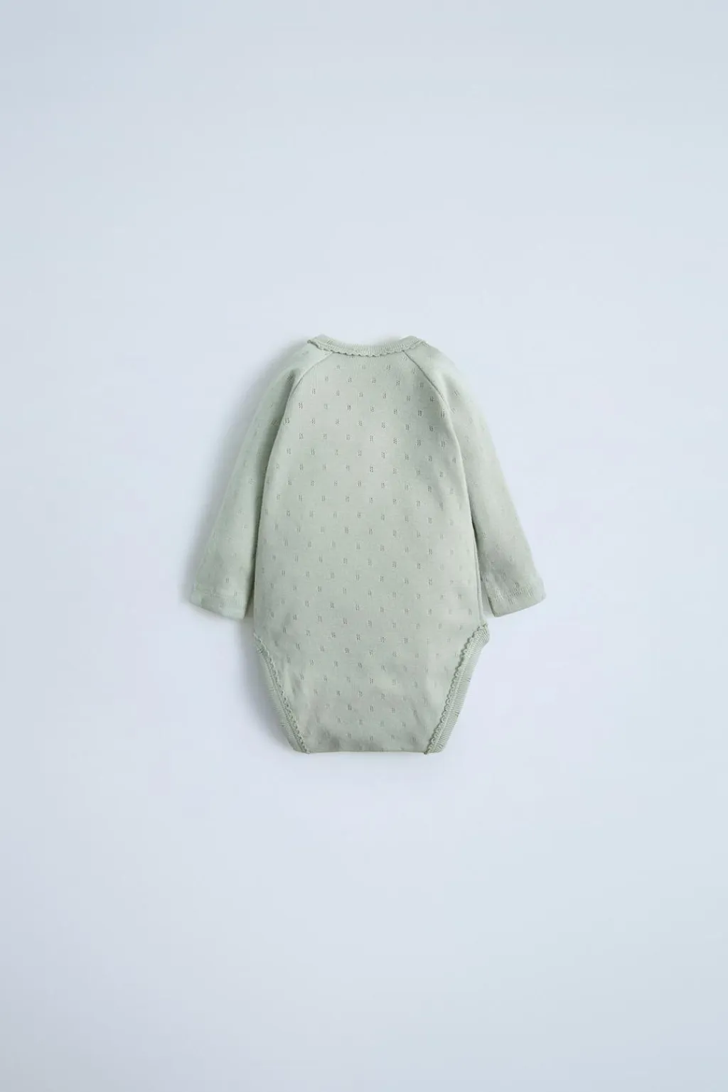 Pack de tres bodies con cuello pico y manga larga. Cierre tipo kimono frontal con botones presión y en bajo.