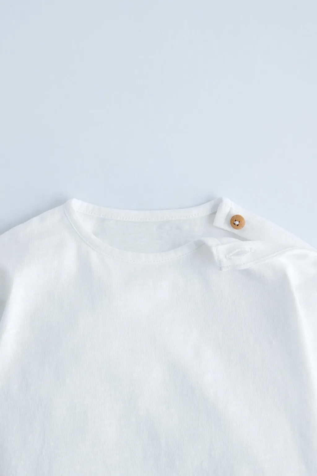 Camiseta con cuello redondo y manga corta acabado vuelta. Cierre con botón en hombro.