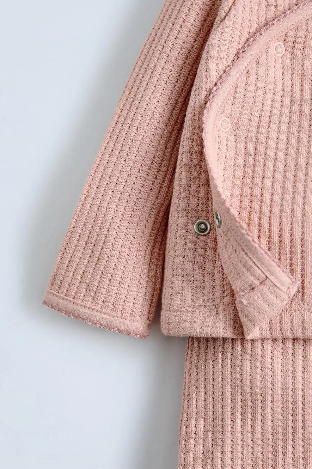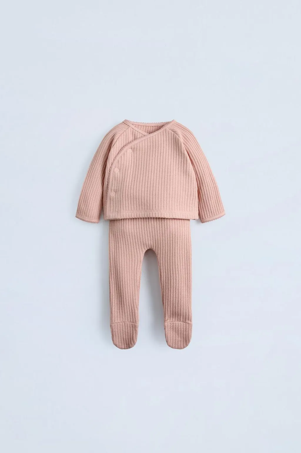Conjunto dos piezas. Camiseta con cuello redondo y manga larga. Cierre botonadura frontal cruzada. Polaina con cinturilla elástica.