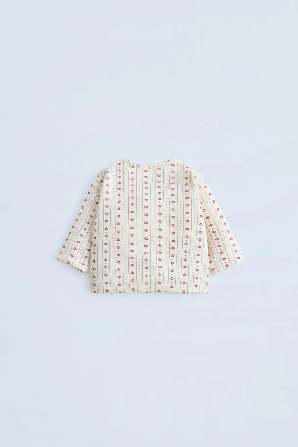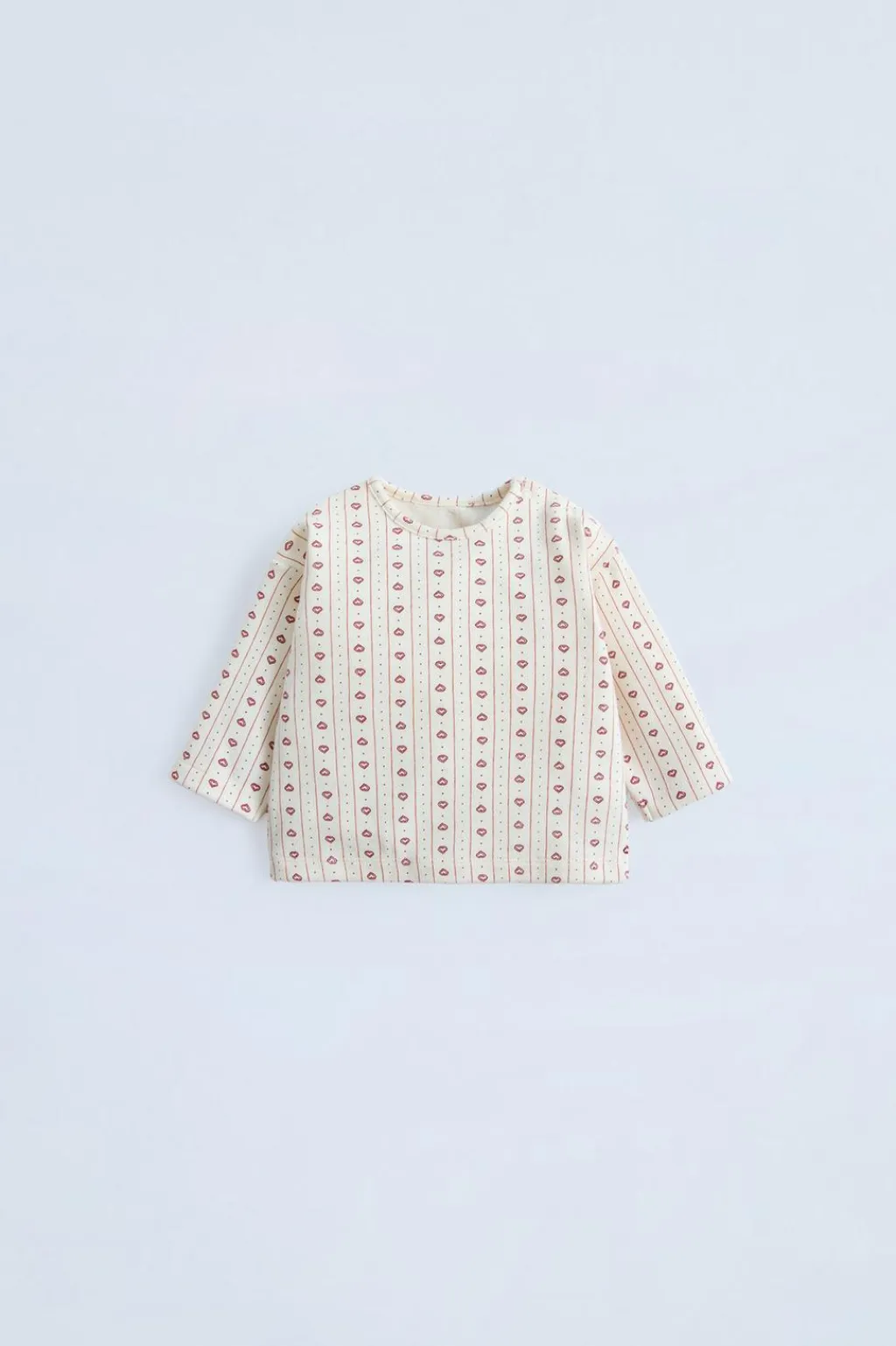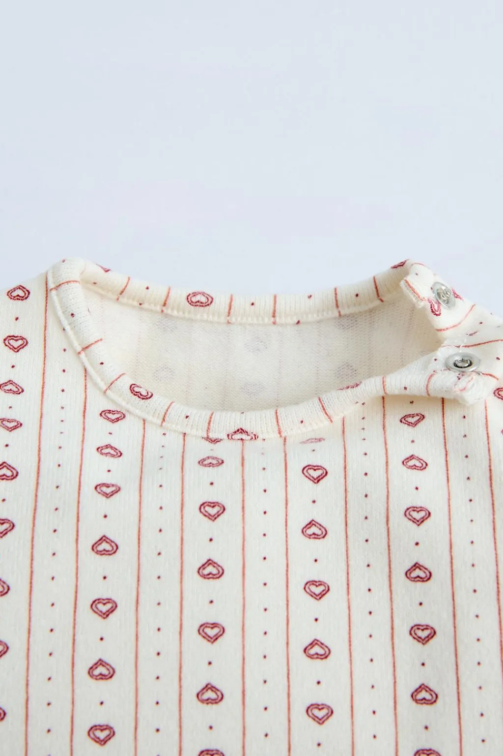 Camiseta con cuello redondo y manga larga. Cierre con botones tipo presión en hombro. Estampado corazones y tejido calentito.