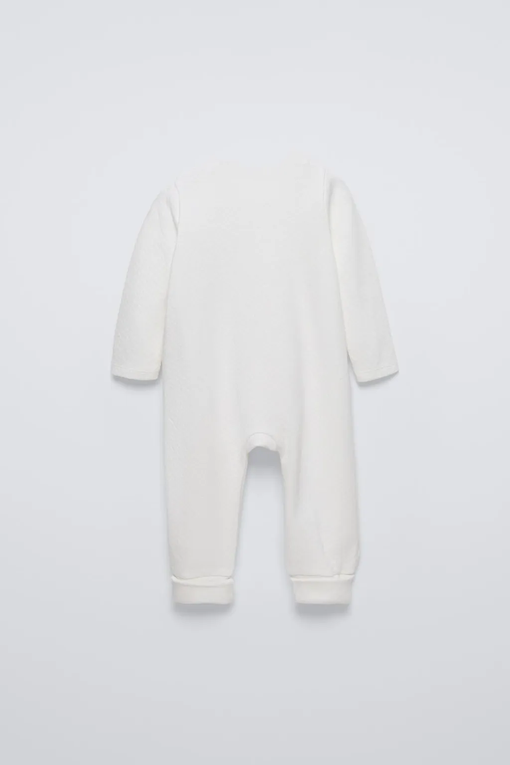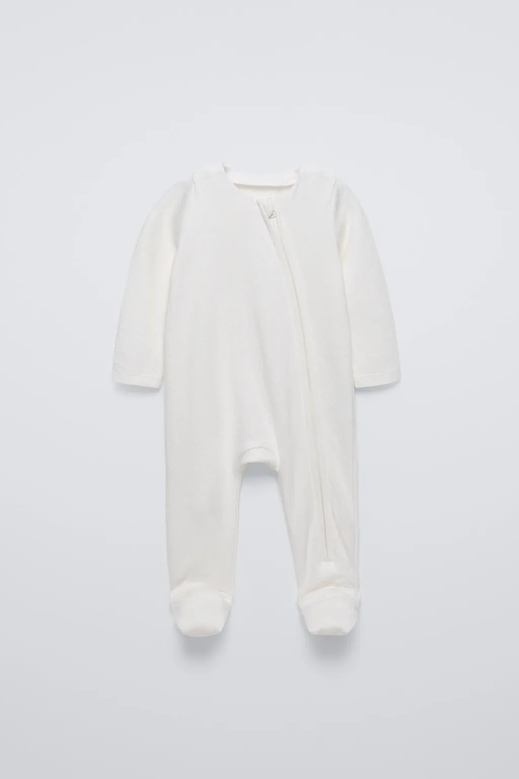 Pijama con cuello redondo y manga larga. Cierre cremallera frontal. Bajo con largo ajustable y opción de convertirse en calcetín, pijama cerrado.