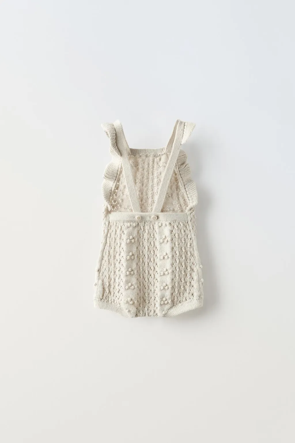 Pelele de punto con cuello recto y tirantes con botón en espalda. Aplique volante en laterales. Cierre con botones en el bajo.