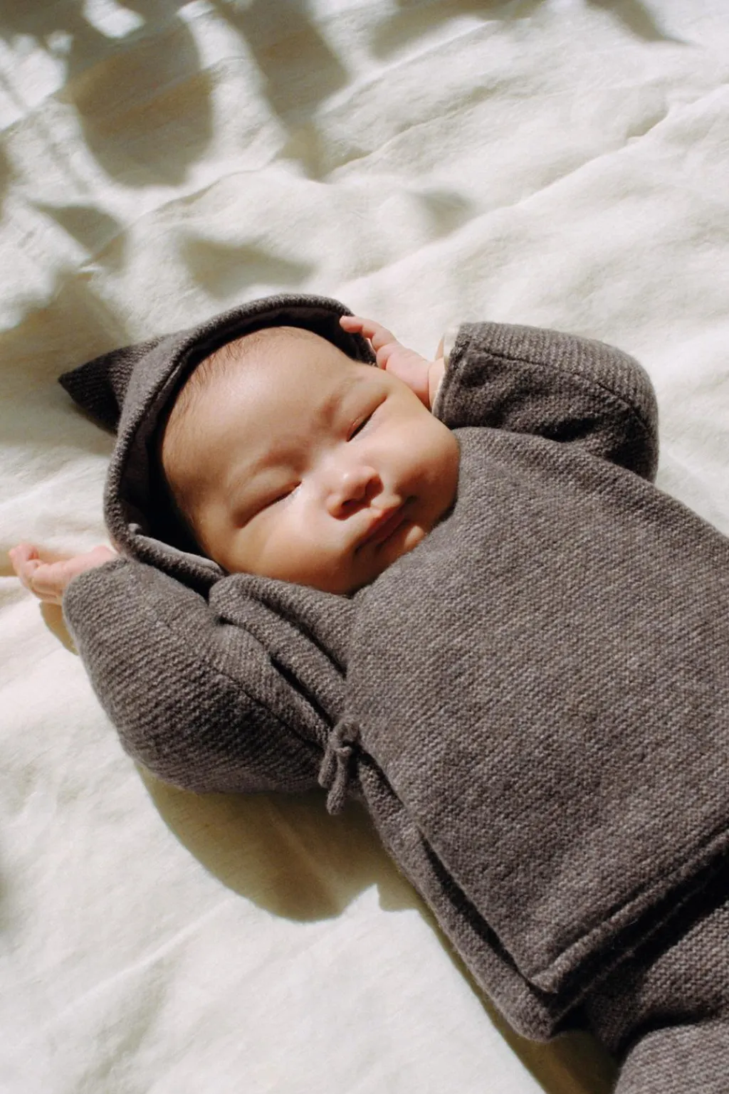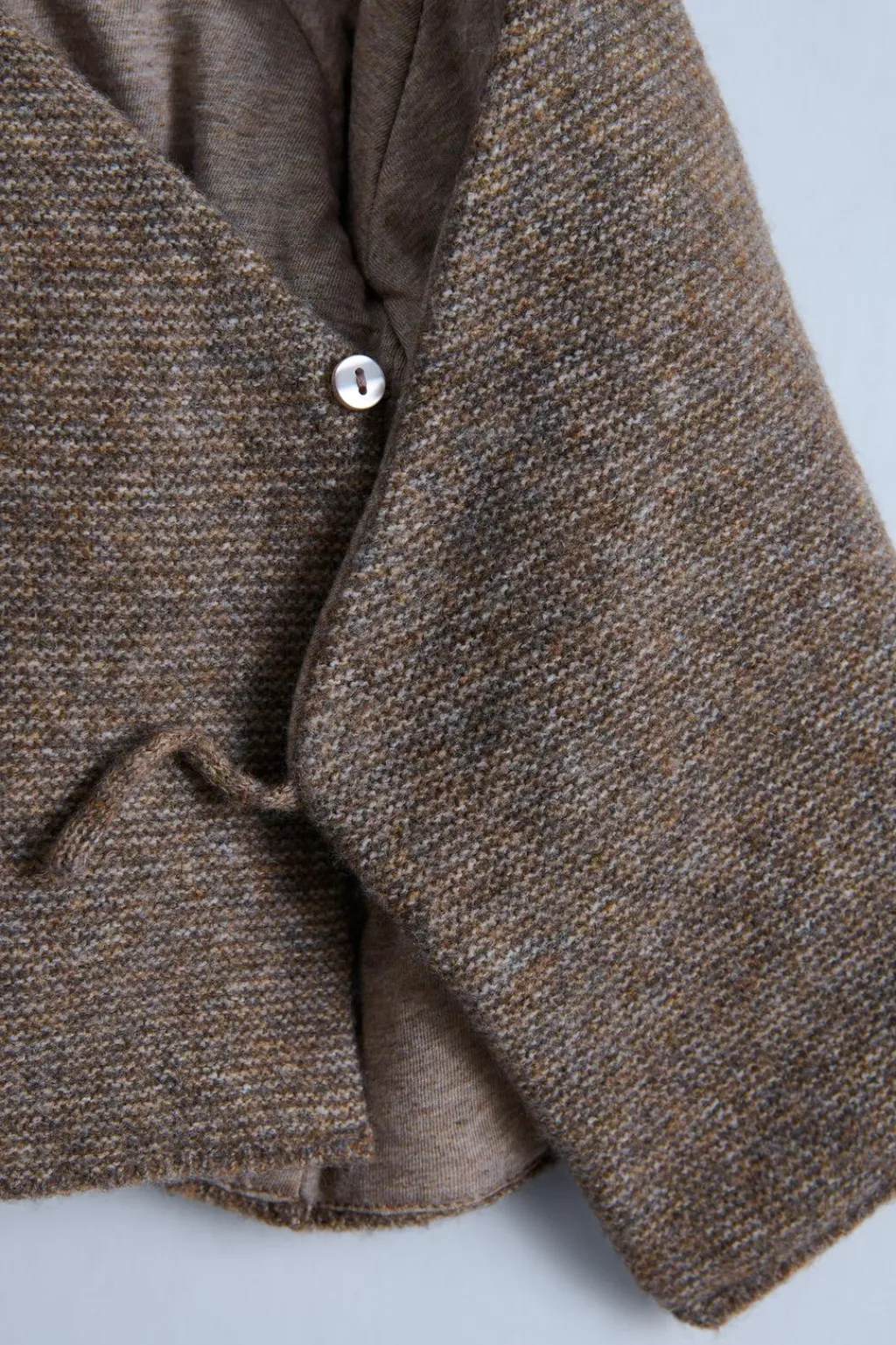 Chaqueta con capucha y manga larga. Cierre cruzado con lazo.