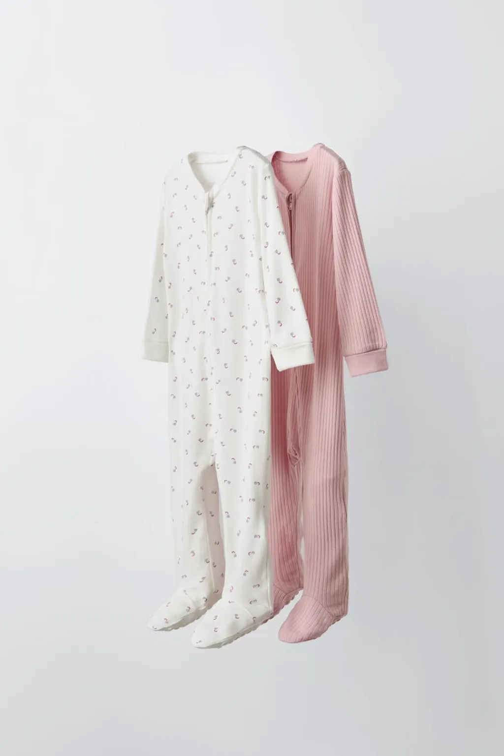 Pack dos pijamas enteros con cuello redondo y manga larga ajustable. Suela antideslizante en el pie. Cierre cremallera frontal.