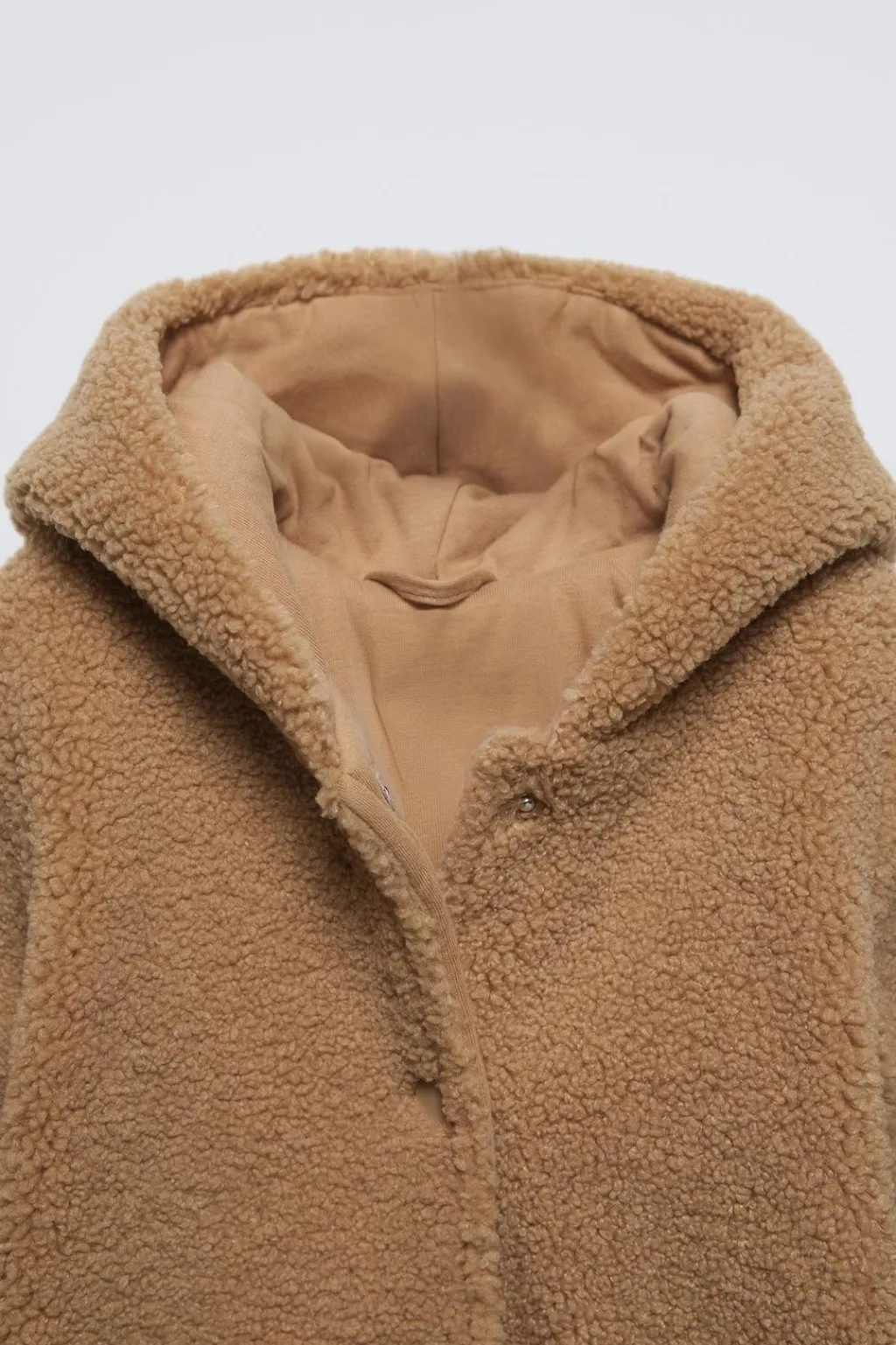 Buzo de borreguillo con capucha y manga larga. Cierre con botones tipo presión y bolsillos tipo plastrón en delantero.Forro interior.