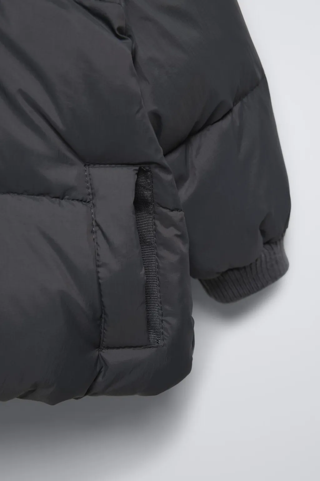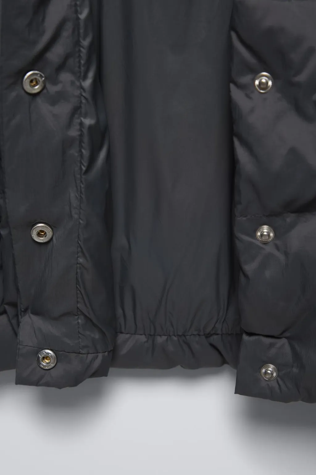 Plumífero con tejido 50% de pluma y 50% de plumón. Con capucha y manga larga acabada en puño. Cierre botones de tipo presión en delantero. Bolsillos delanteros. Forro interior combinado a tono. Bajo acabado en goma.