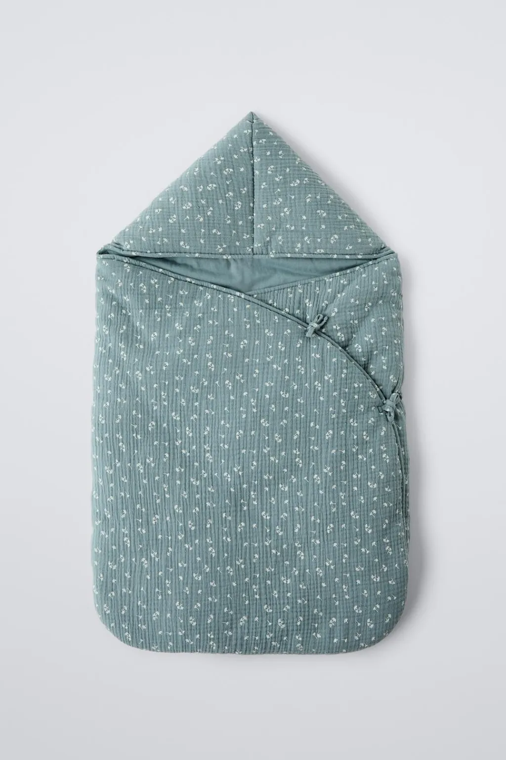 Saco portabebés acolchado con capucha. Cierre cruzado con aplique lazos y cremallera en bajo.