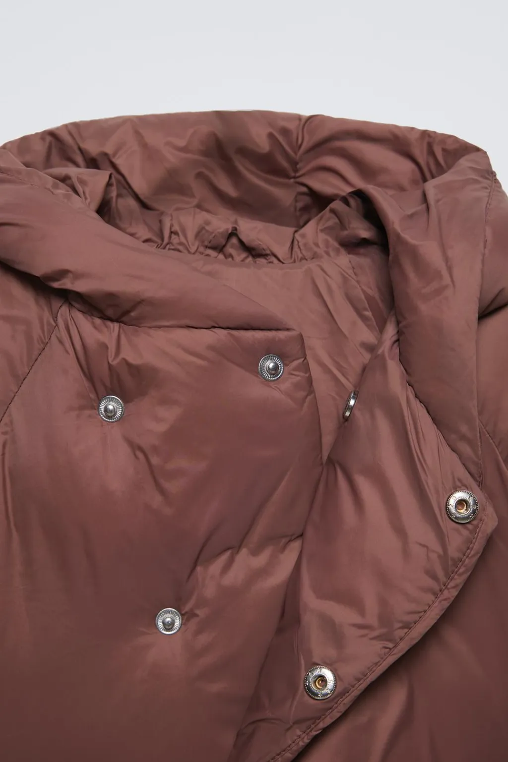 Abrigo con capucha y manga larga acabada en goma. Cierre con botones tipo presión en delantero.
