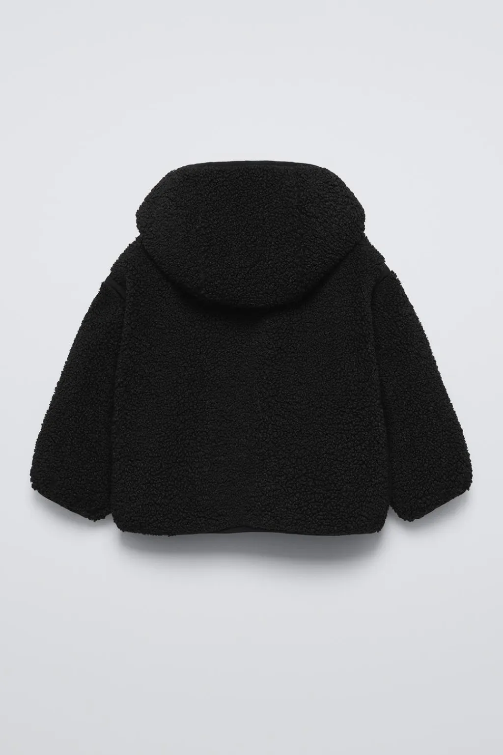Chaqueta de borreguillo con capucha y manga larga acabada en goma. Cierre con cremallera frontal y bolsillos con detalle vivo en delantero. Interior con forro polar.