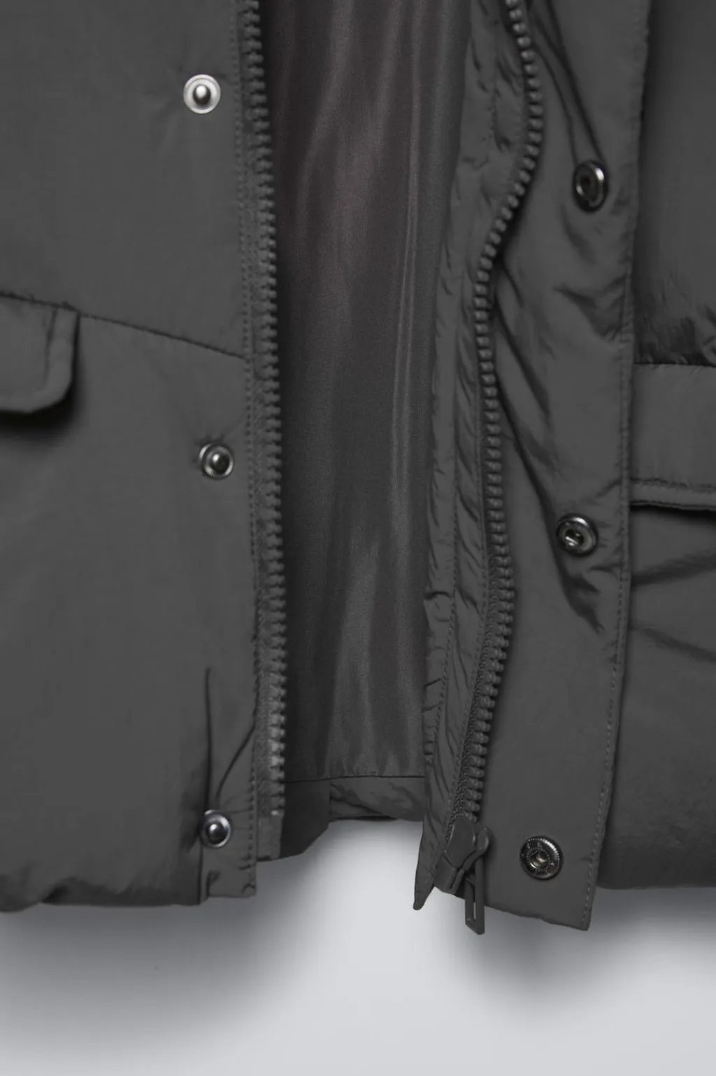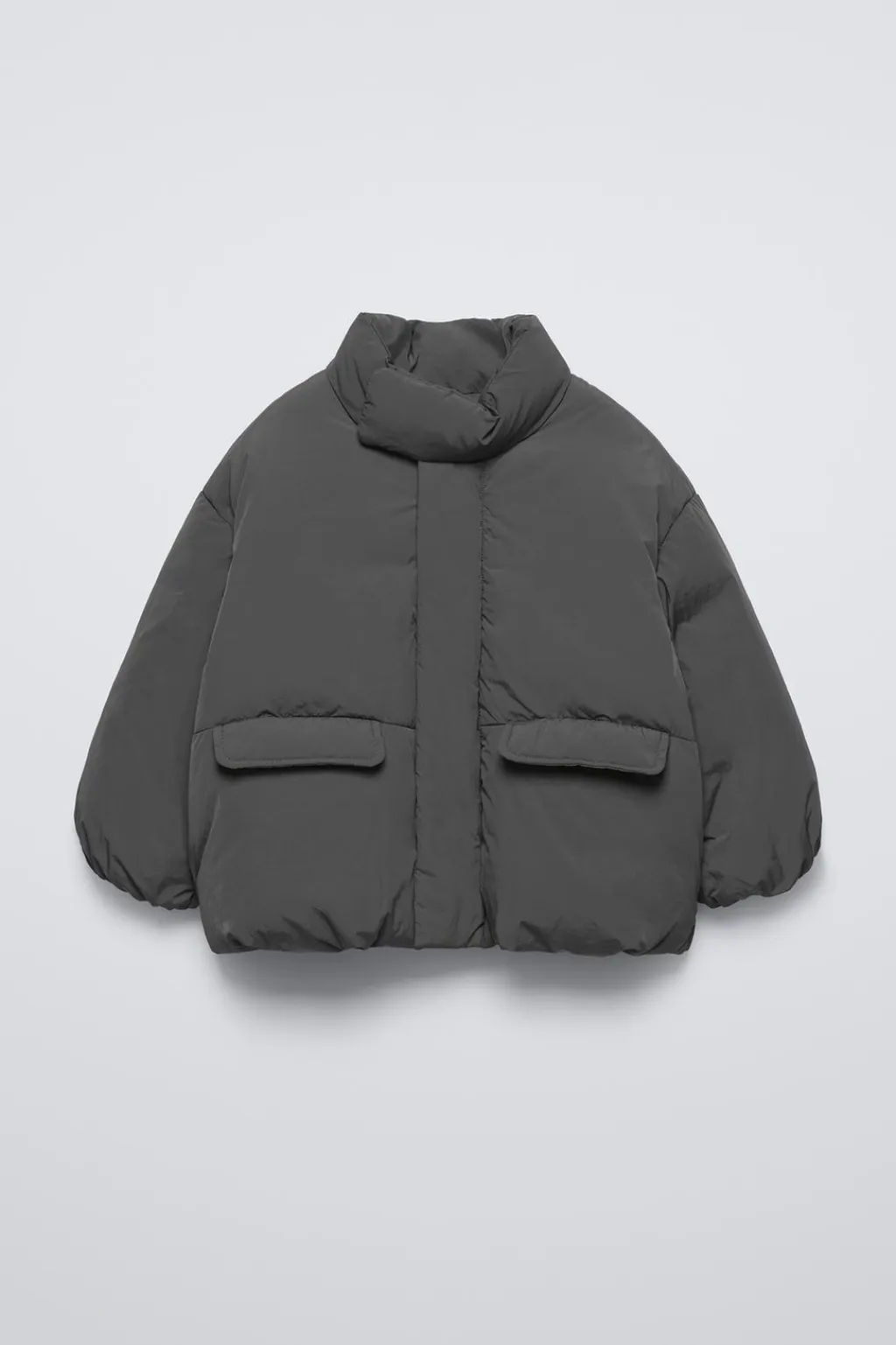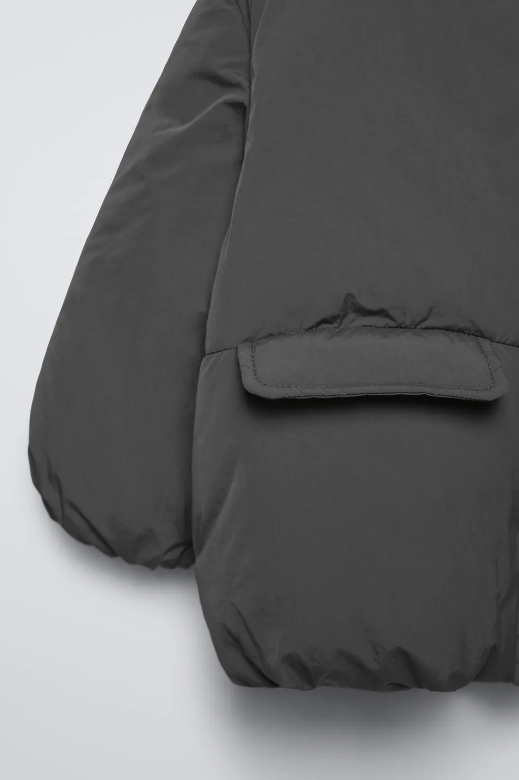 Cazadora con fit oversize, con cuello subido y manga larga acabada en goma. Cierre cremallera frontal oculta por solapa y cierre botones presión. Bolsillos delanteros con tapeta.