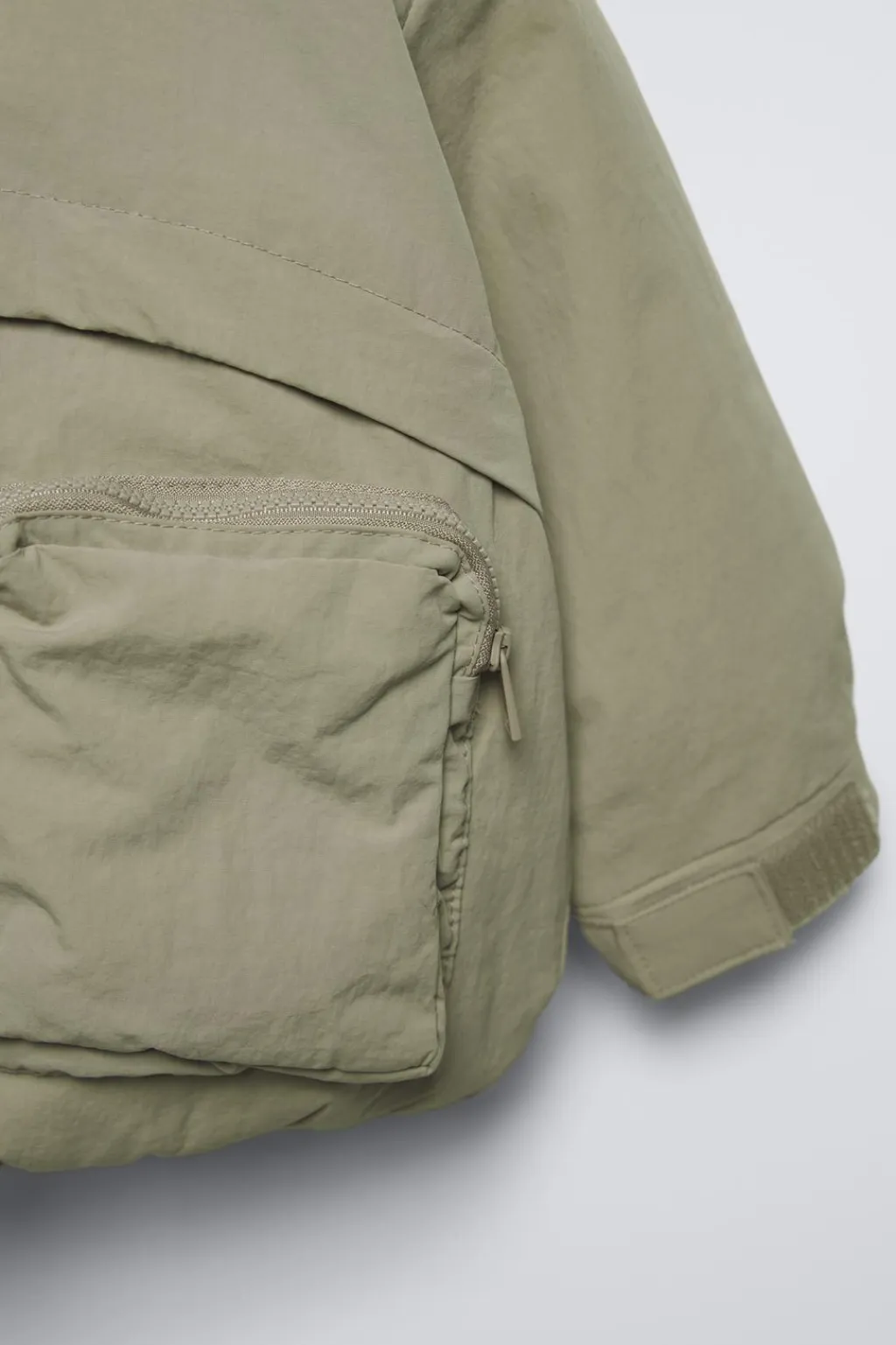 Chaqueta con un tejido especial repelente al agua, con capucha y manga larga acabada en cierre ajustable por adhesivo. Cierre con cremallera frontal y bolsillos tipo plastrón con cierre cremallera en delantero.