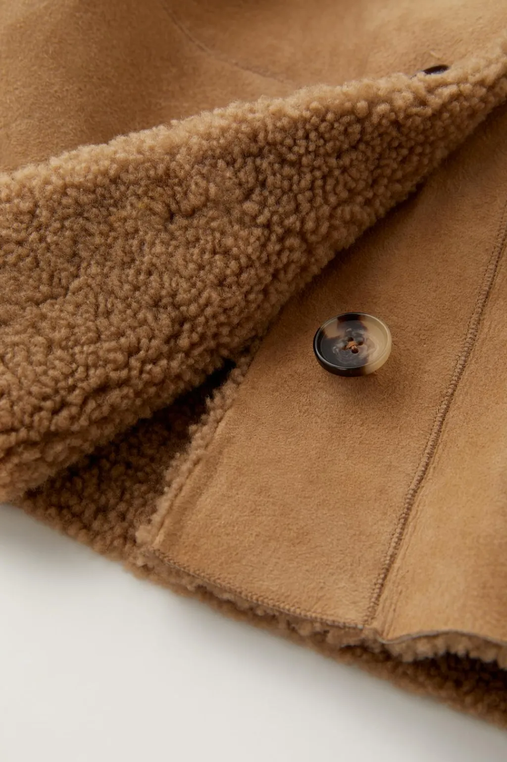 Abrigo 100% piel combinado borreguillo. Cuello solapas y manga larga acabada en vuelta. Cierre botonadura frontal. Bolsillos en laterales.