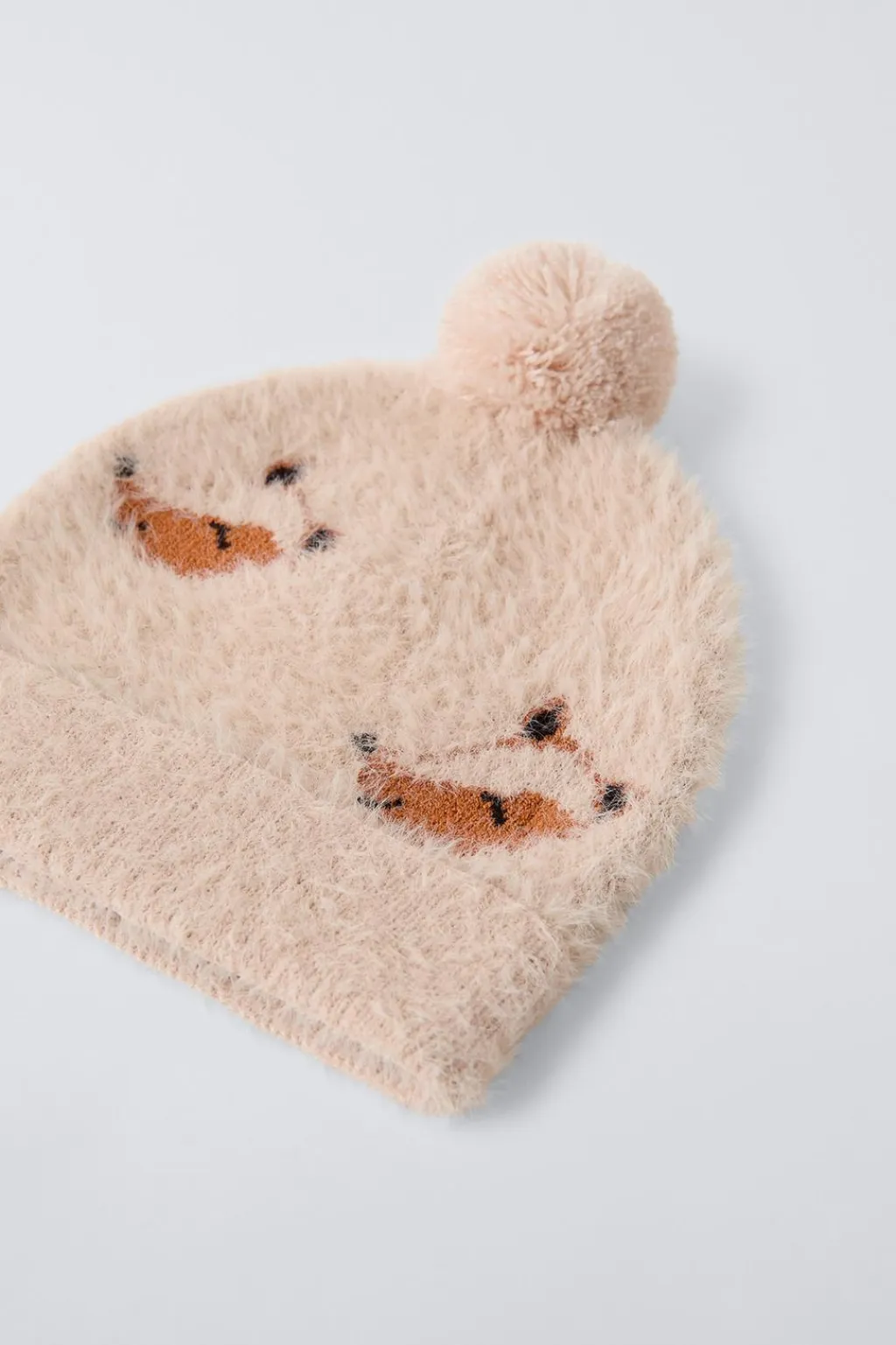 Gorro con bajo acabado en vuelta. Aplique pompón y bordado zorritos.