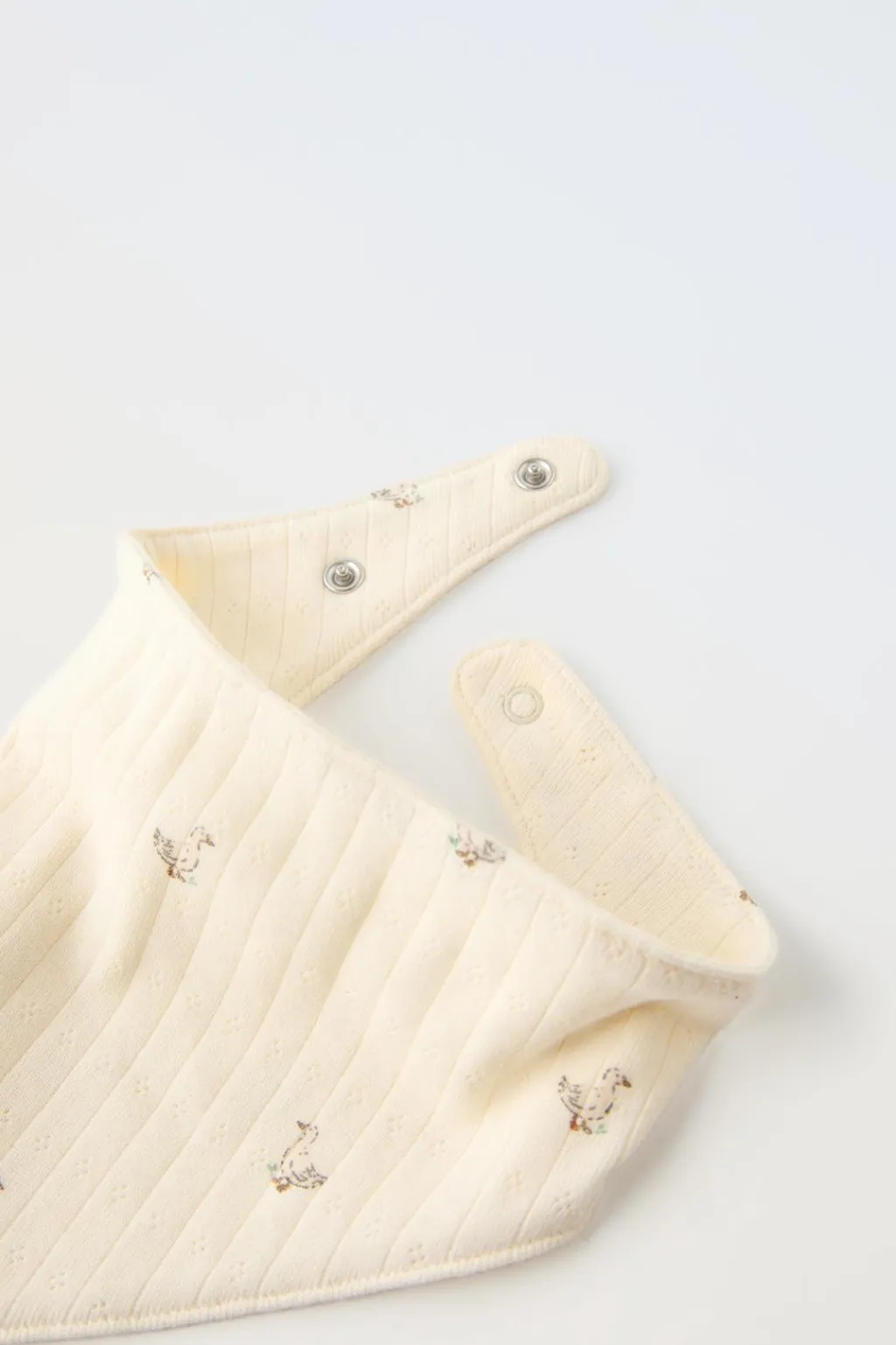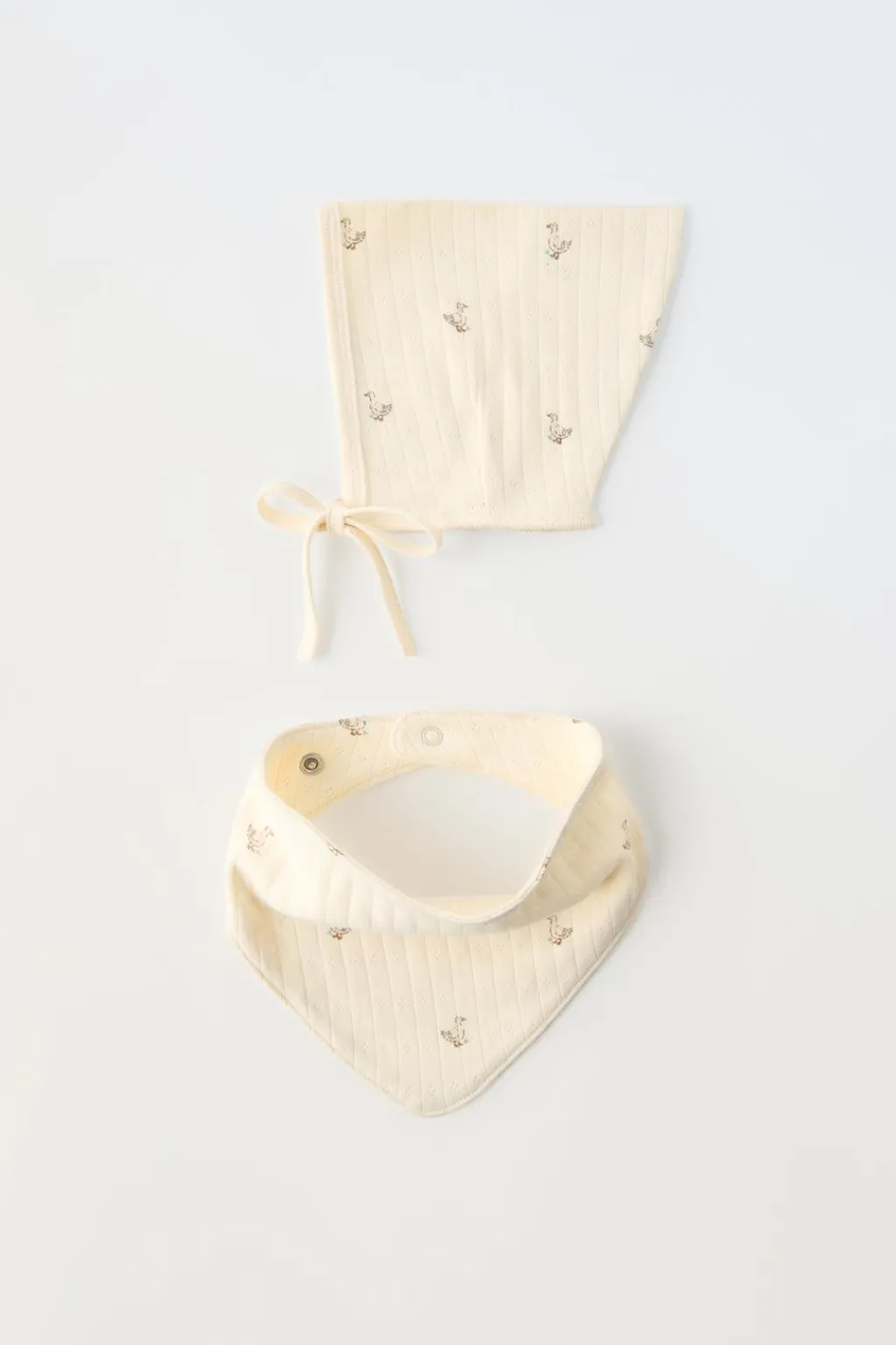 Pack de dos piezas. Capota con cordones ajustables frontal. Bandana con cierre ajustables de tipo presión. Estampado patitos.